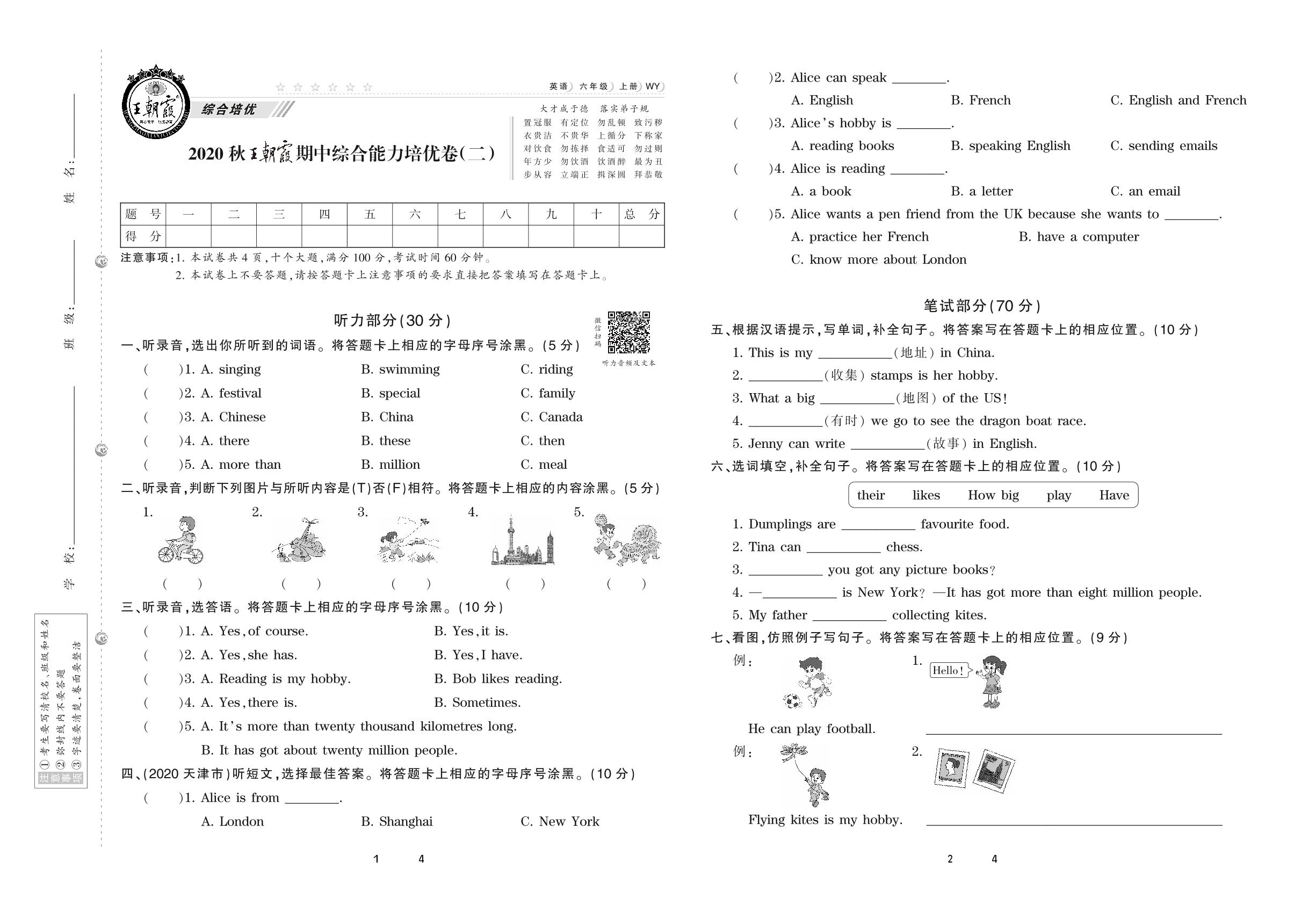 2020上册六年级英语外研版 王朝霞期中综合能力培优卷(二)