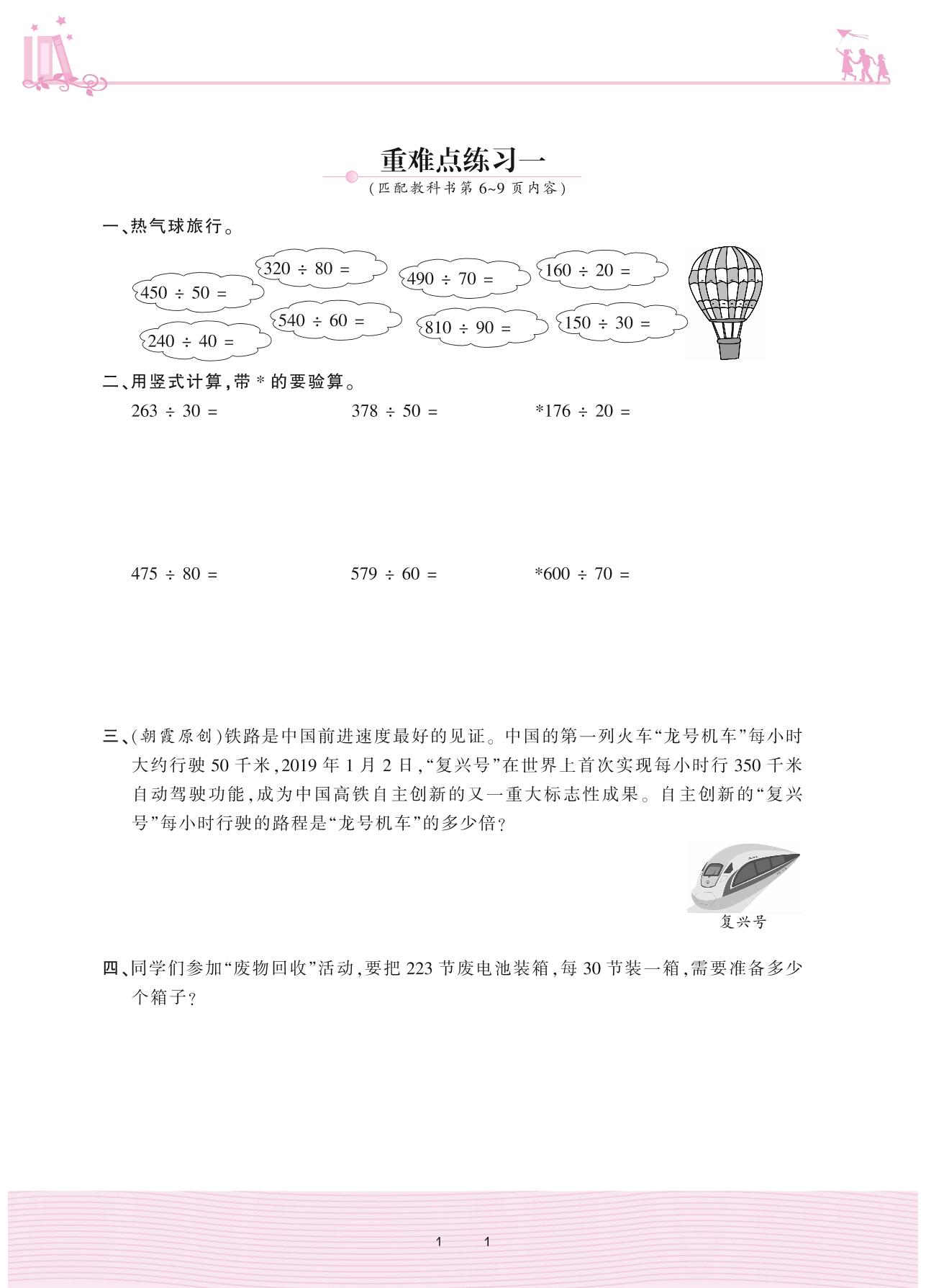 2020上册四年级数学冀教版 二 三位数除以两位数——重难点练习一