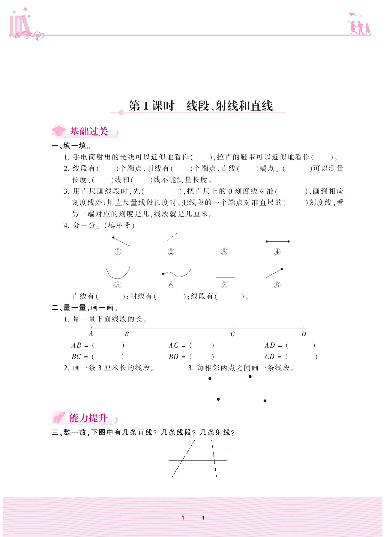 2020上册四年级数学冀教版 四 线和角 1. 线——第1课时 线段、射线和直线