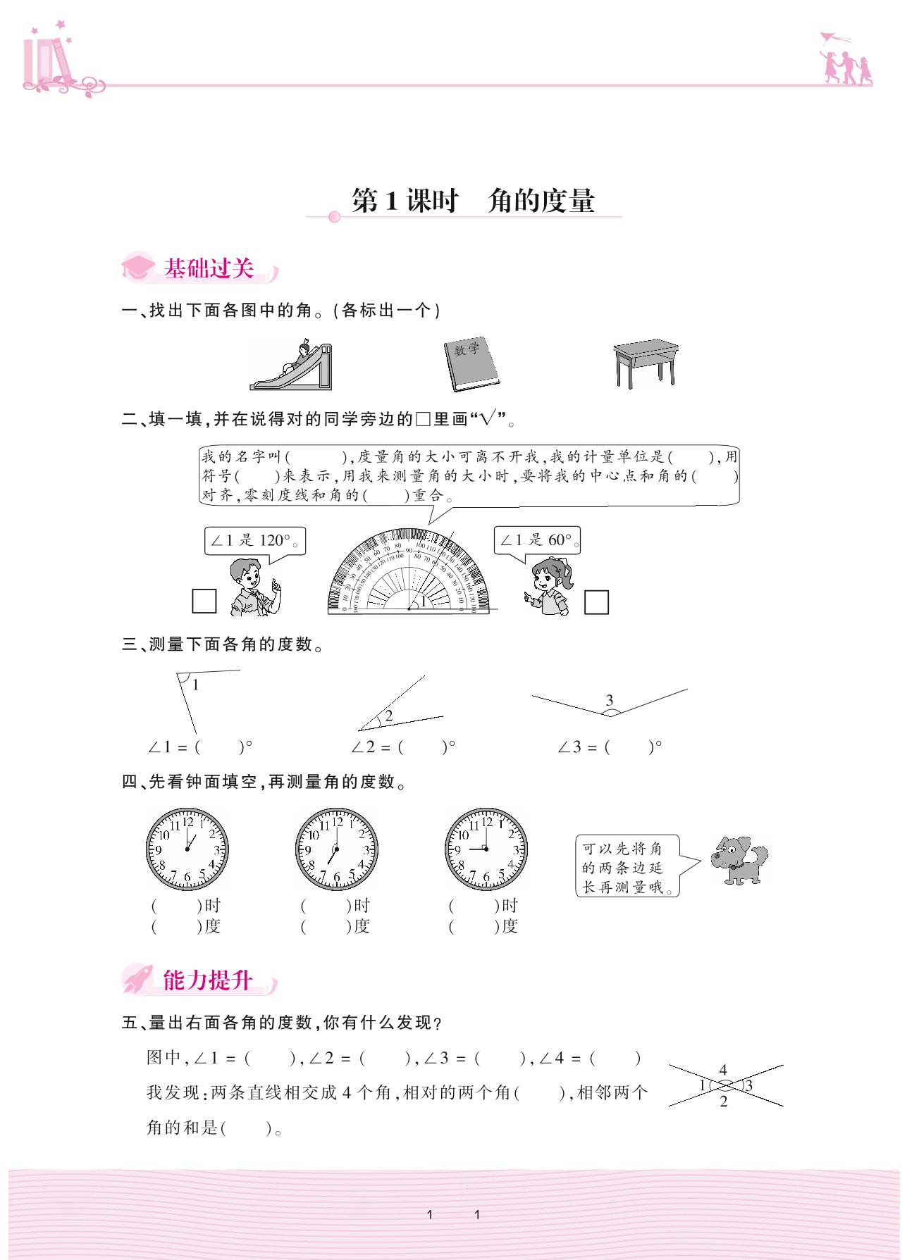 2020上册四年级数学冀教版 四 线和角 2. 角——第1课时 角的度量