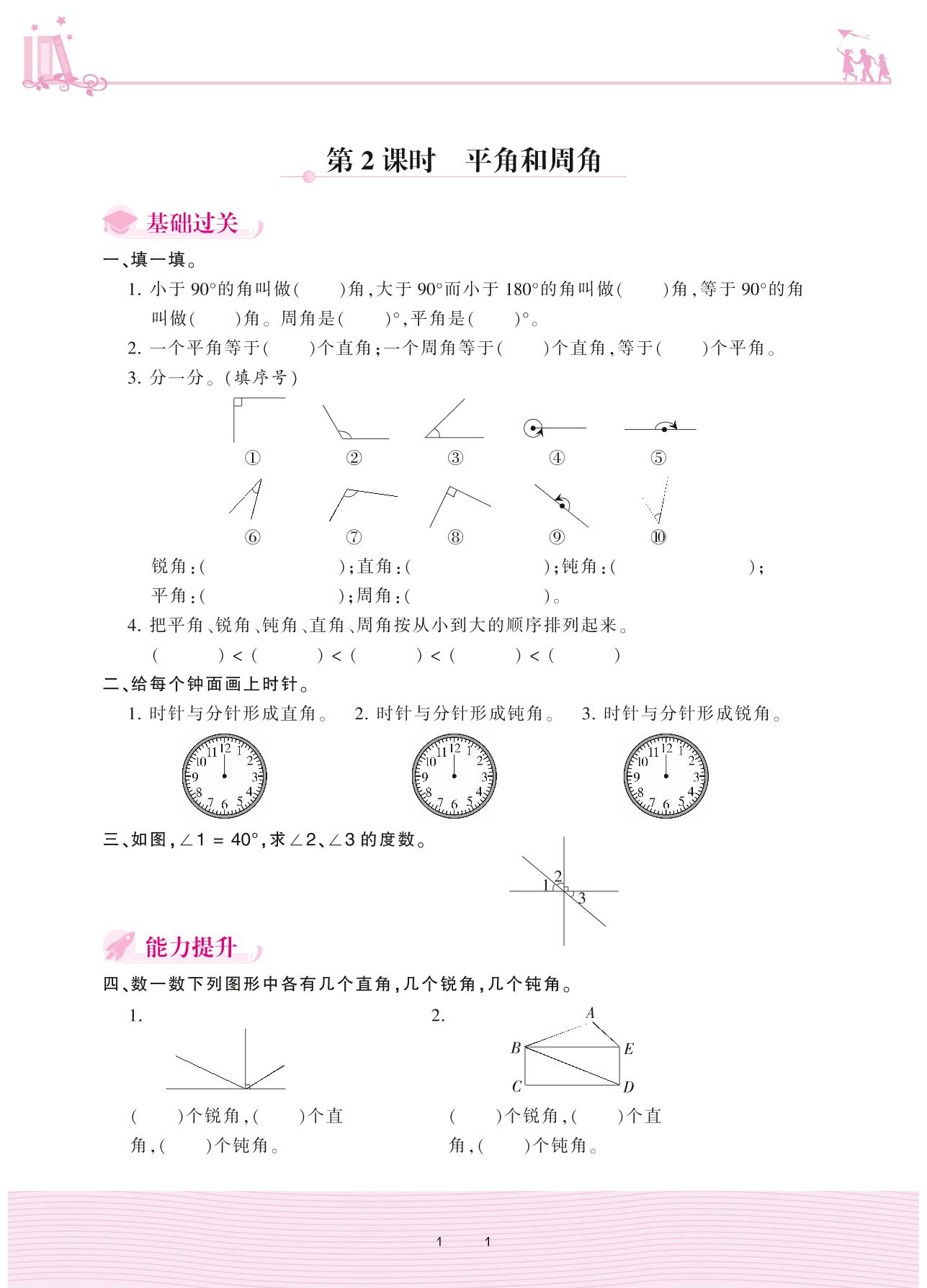 2020上册四年级数学冀教版 四 线和角 2. 角——第2课时 平角和周角