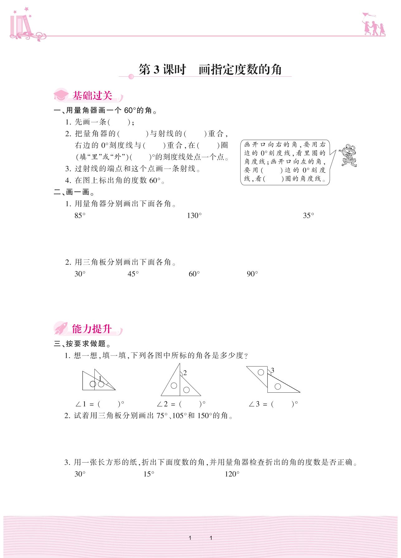 2020上册四年级数学冀教版 四 线和角 2. 角——第3课时 画指定度数的角