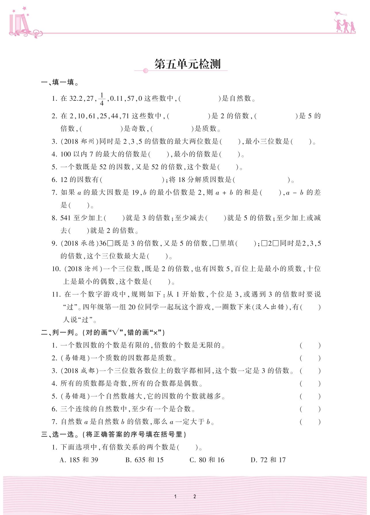 2020上册四年级数学冀教版 第五单元检测