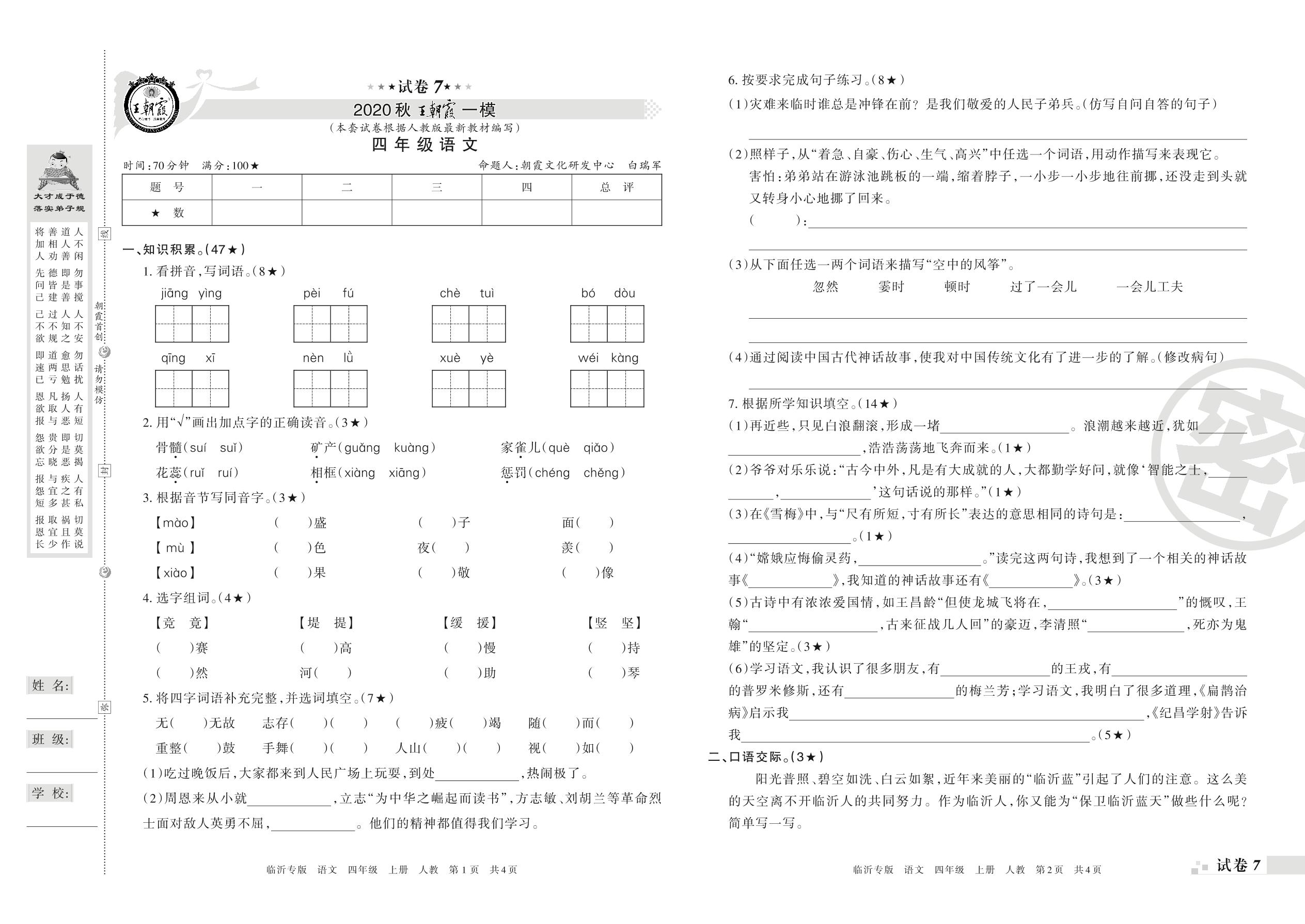 王朝霞期末模拟卷四年级上册语文(人教版)_R210801185155【7】
