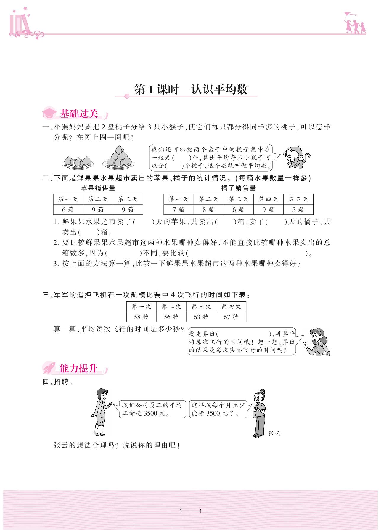 2020上册四年级数学冀教版 八 平均数和条形统计图——第1课时 认识平均数