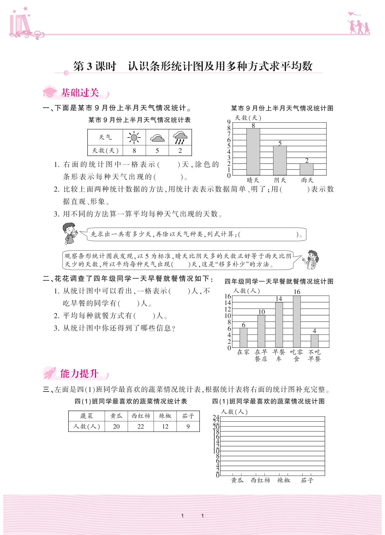 2020上册四年级数学冀教版 八 平均数和条形统计图——第3课时 认识条形统计图及用多种方式求平均数