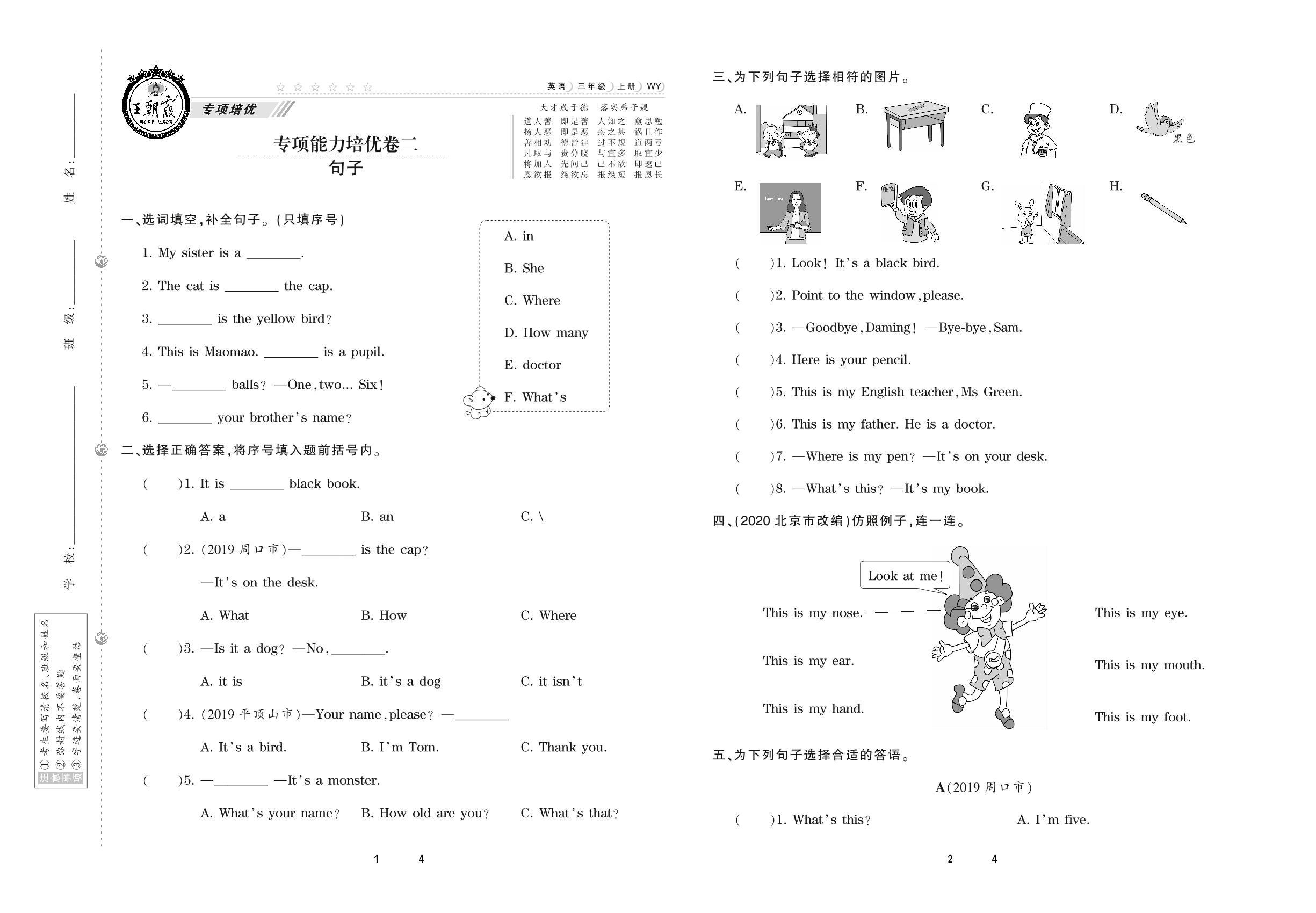 2020上册三年级英语外研版 专项能力培优卷二 句子