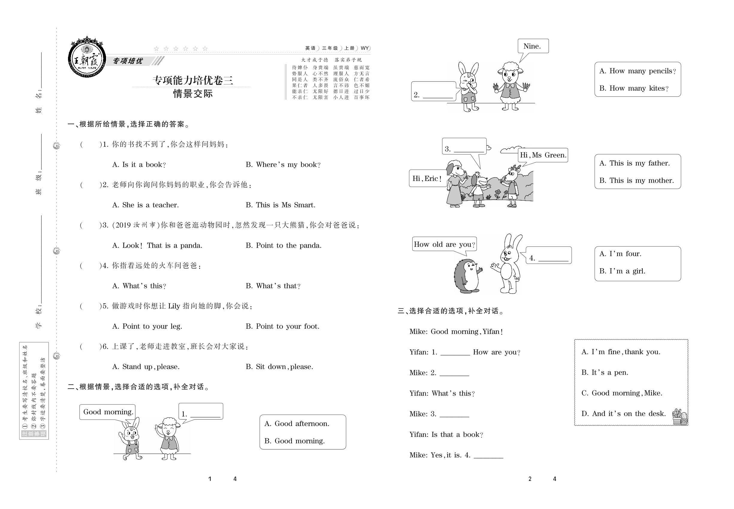 2020上册三年级英语外研版 专项能力培优卷三 情景交际