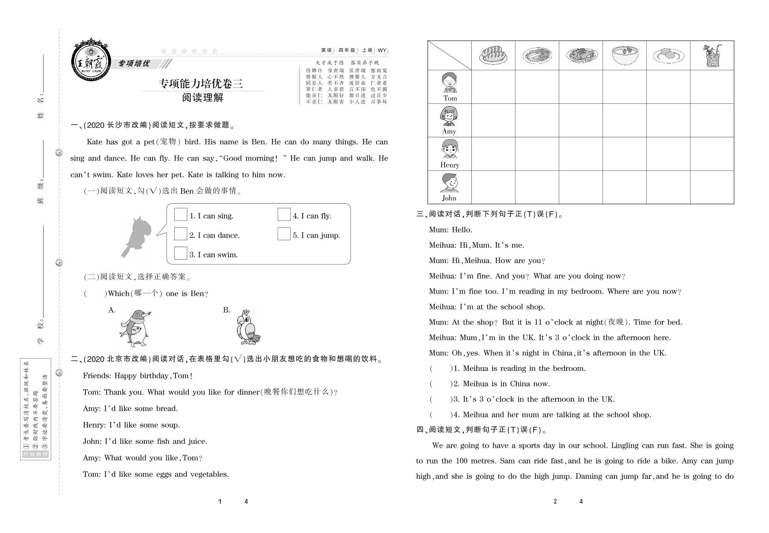 2020上册四年级英语外研版 专项能力培优卷三 阅读理解