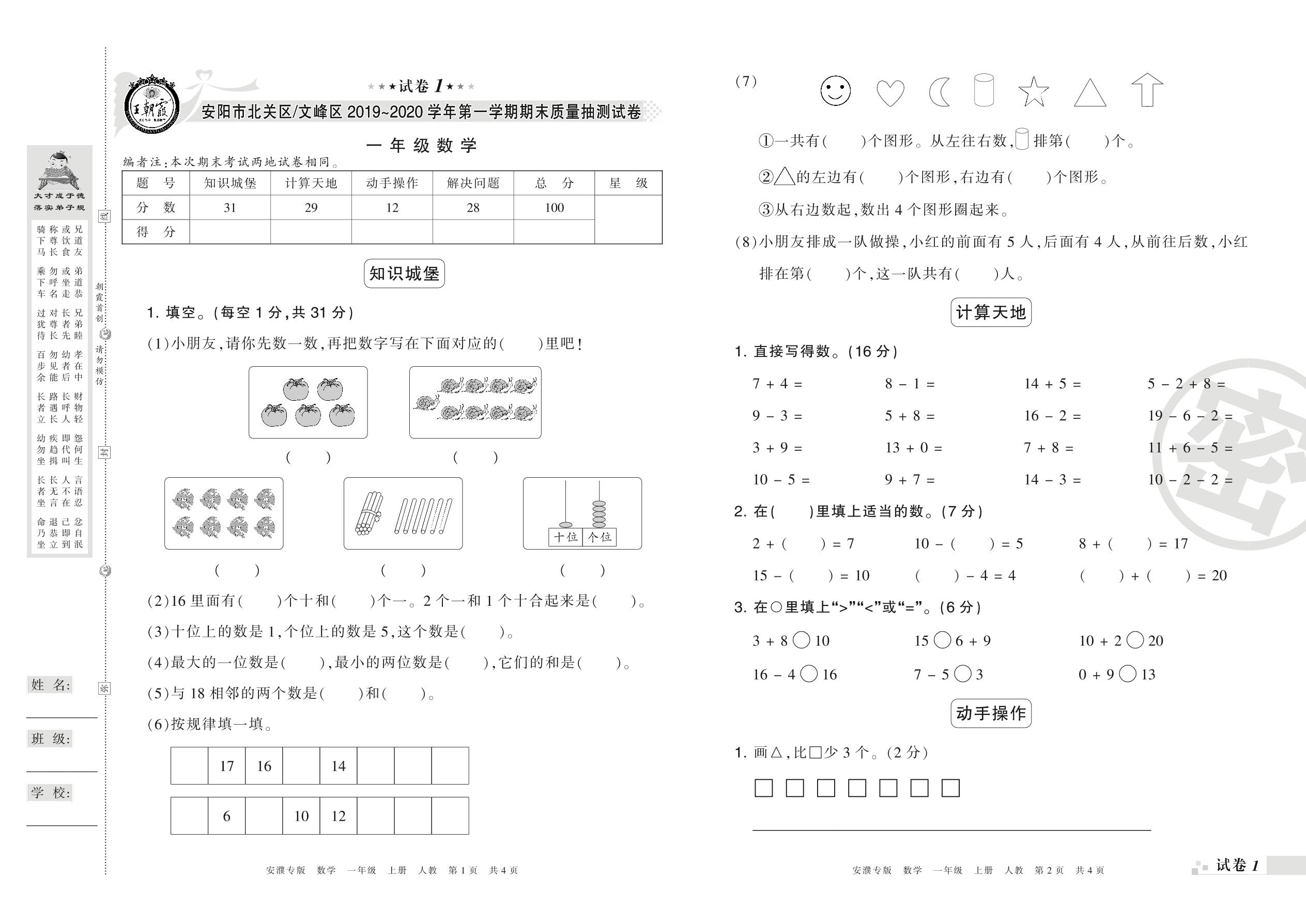 2019-2020学年第一学期安阳市北关区、文峰区一年级数学试卷(人教版)_R210801185247【1】