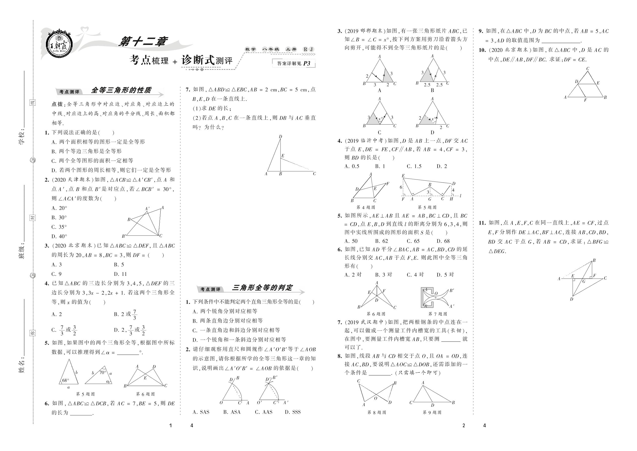 2020上册八年级数学人教版 第十二章 考点梳理 + 诊断式测评