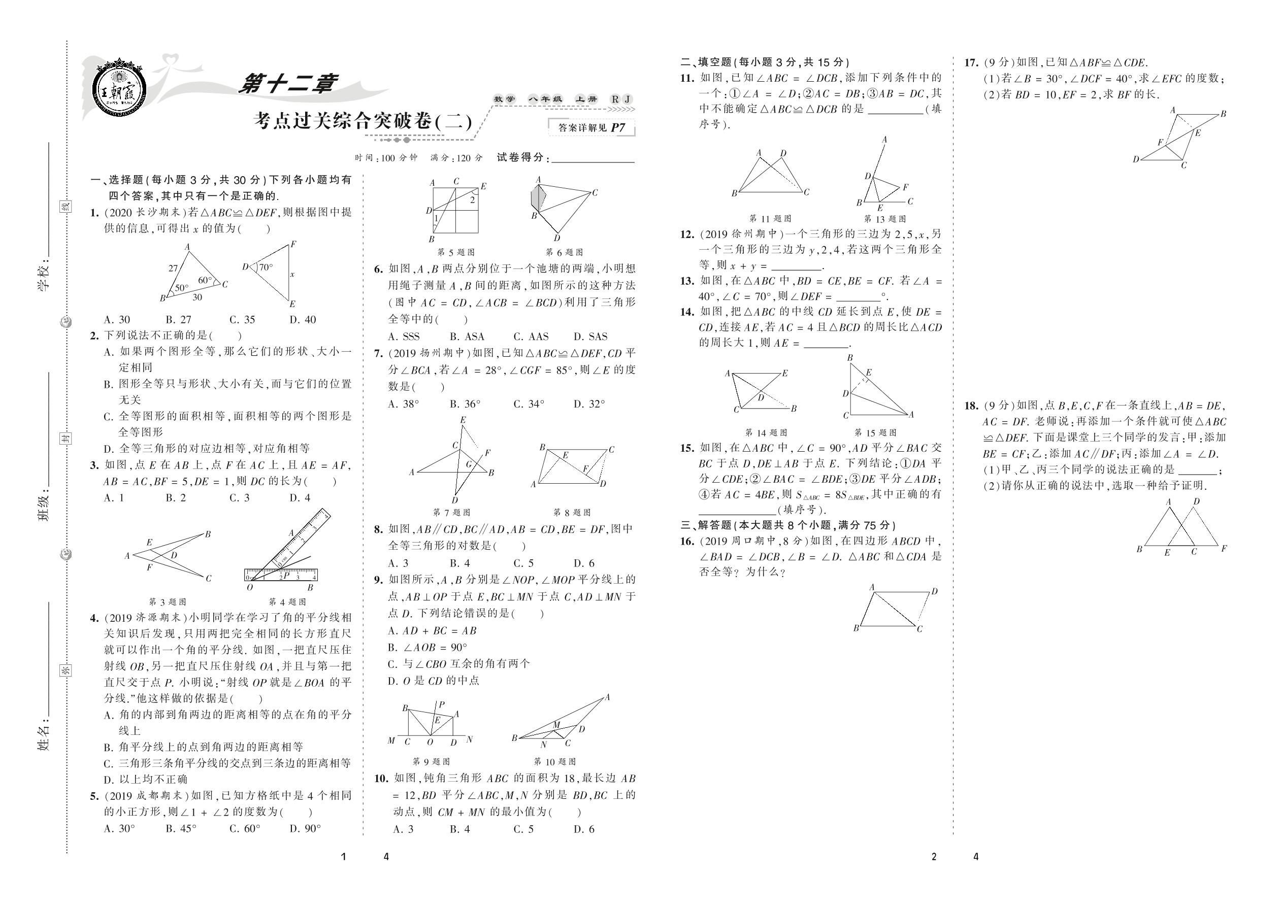 2020上册八年级数学人教版 第十二章 考点过关综合突破卷(二)