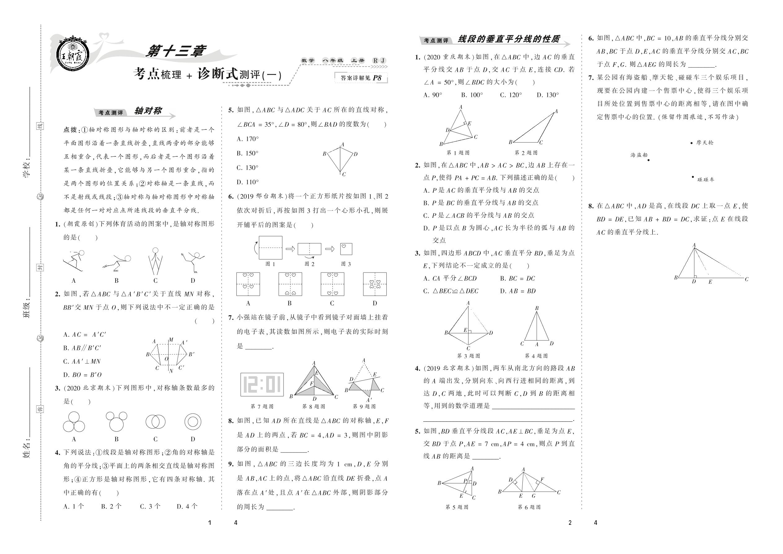 2020上册八年级数学人教版 第十三章 考点梳理 + 诊断式测评(一)