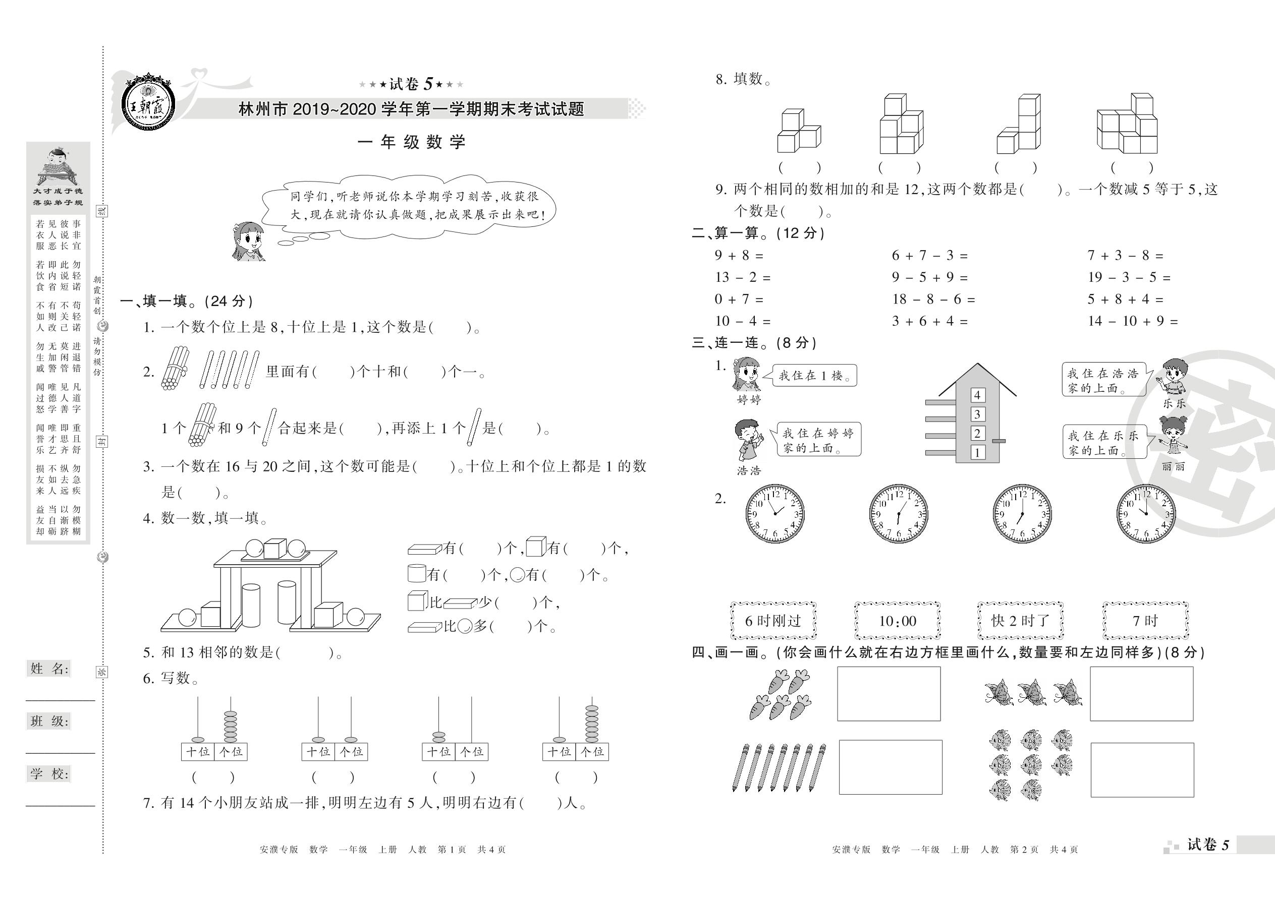 2019-2020学年第一学期林州市一年级数学试卷(人教版)【5】