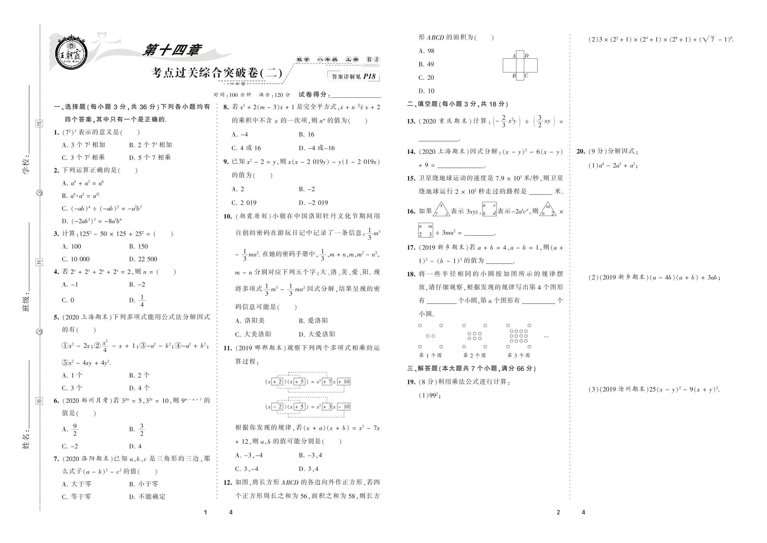 2020上册八年级数学人教版 第十四章 考点过关综合突破卷(二)