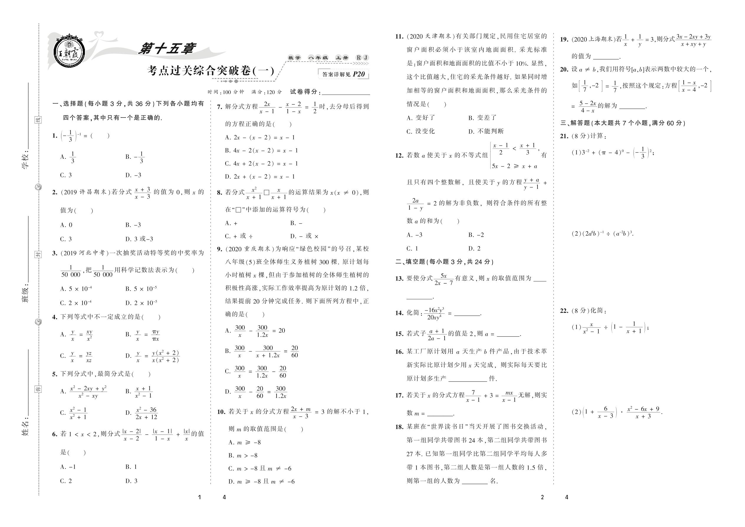 2020上册八年级数学人教版 第十五章 考点过关综合突破卷(一)