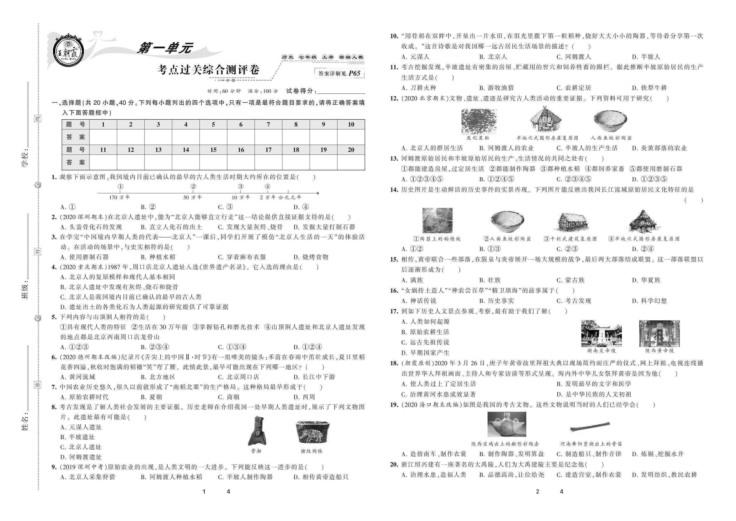 2020上册七年级历史人教版 第一单元 考点过关综合测评卷
