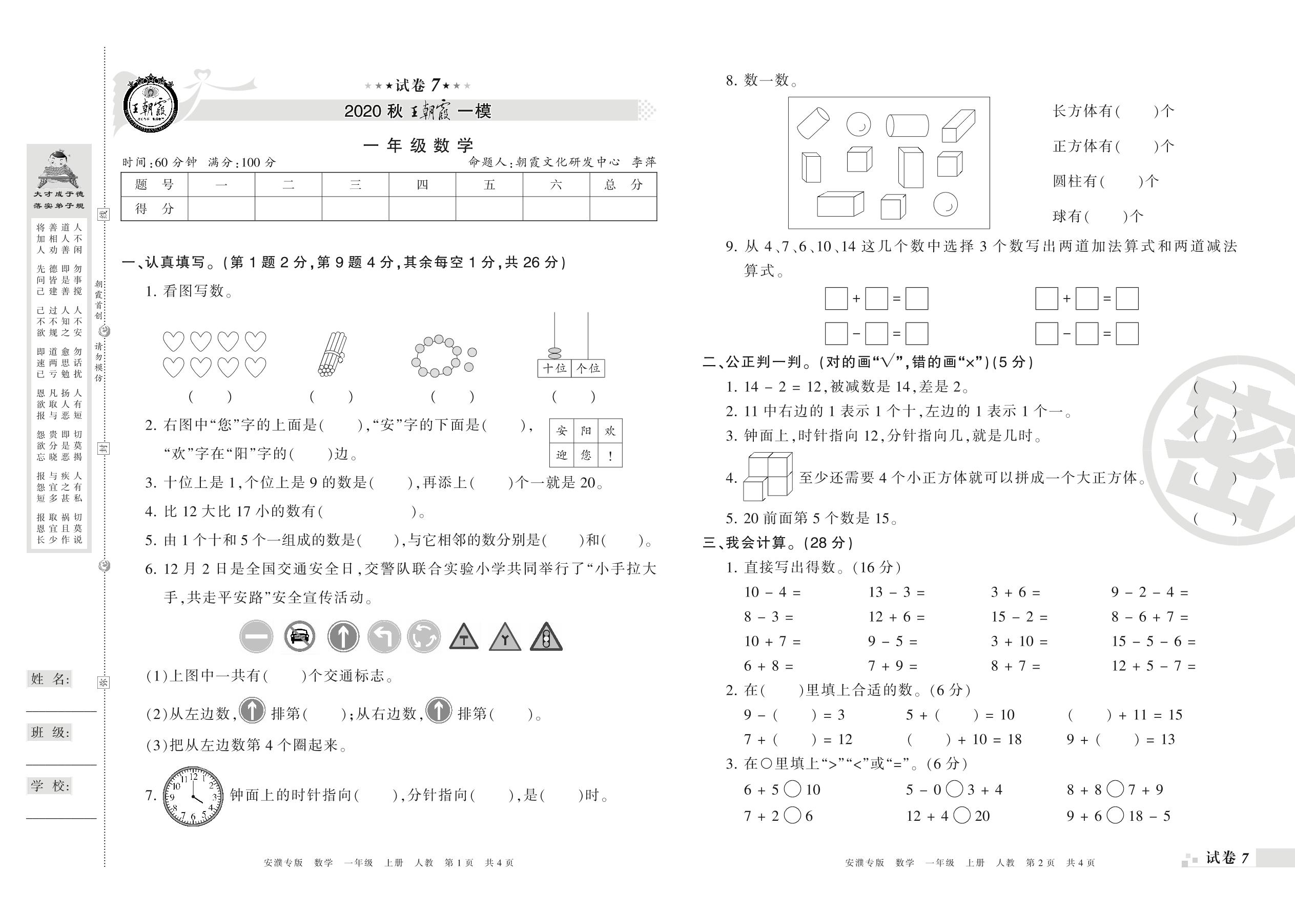 王朝霞期末模拟卷一年级上册数学(人教版)_R210801185247【7】