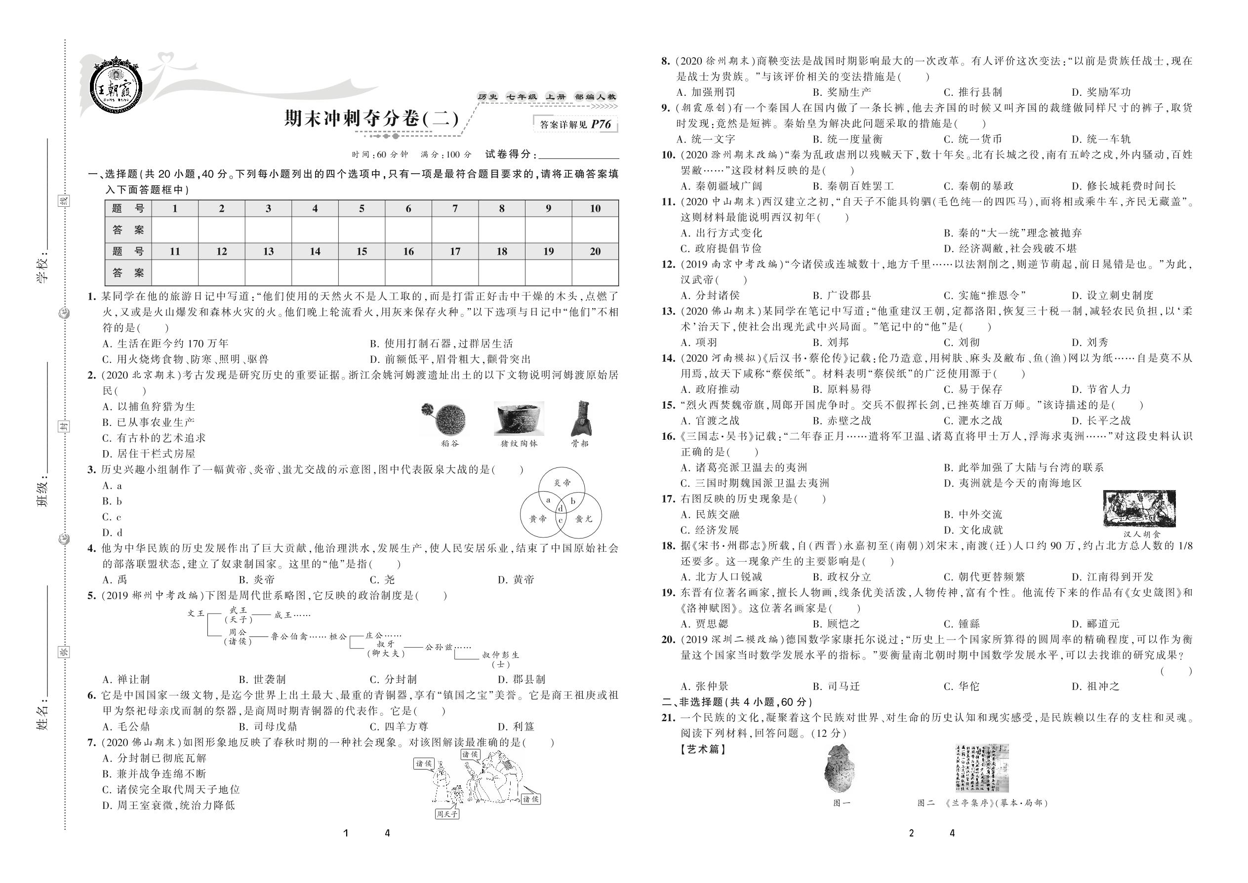 2020上册七年级历史人教版 期末冲刺夺分卷(二)