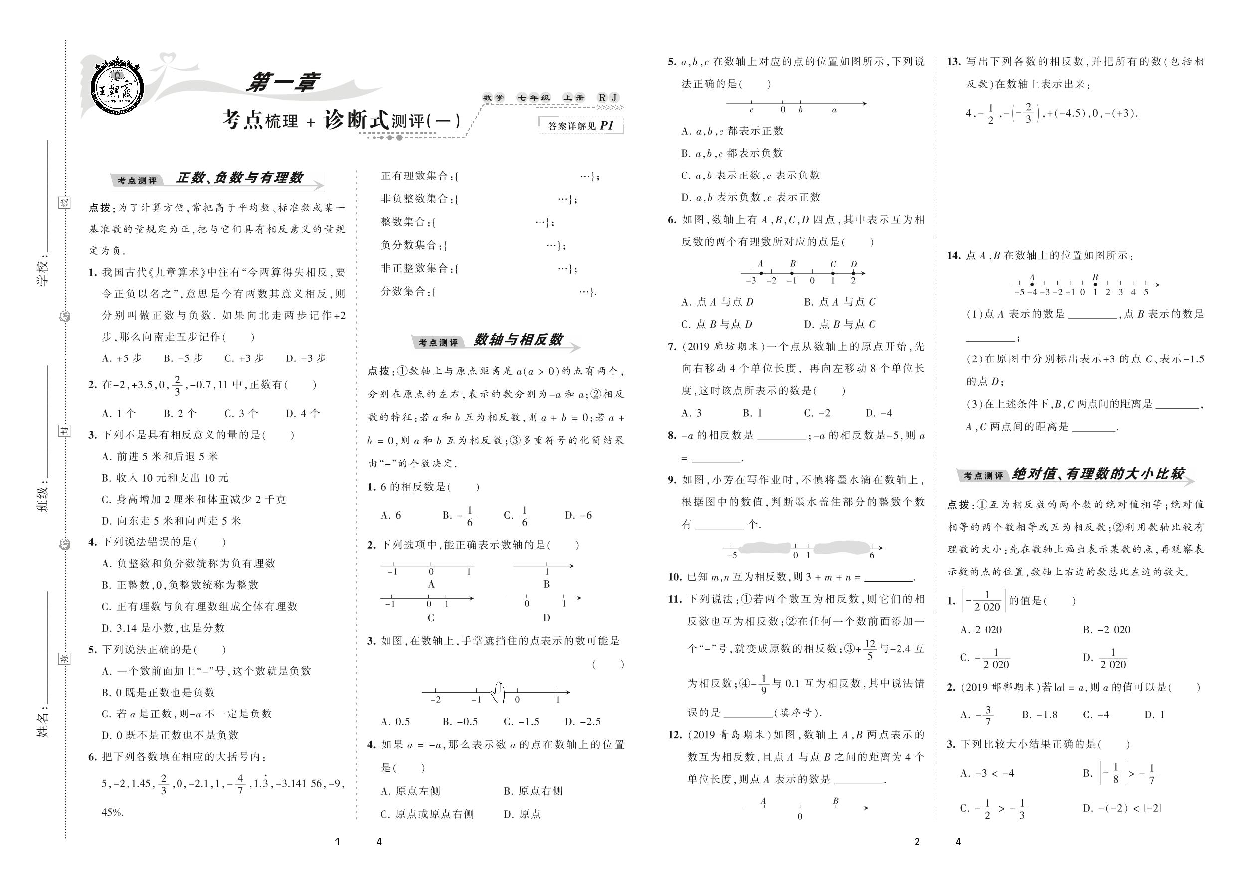 2020上册七年级数学人教版 第一章 考点梳理 + 诊断式测评(一)