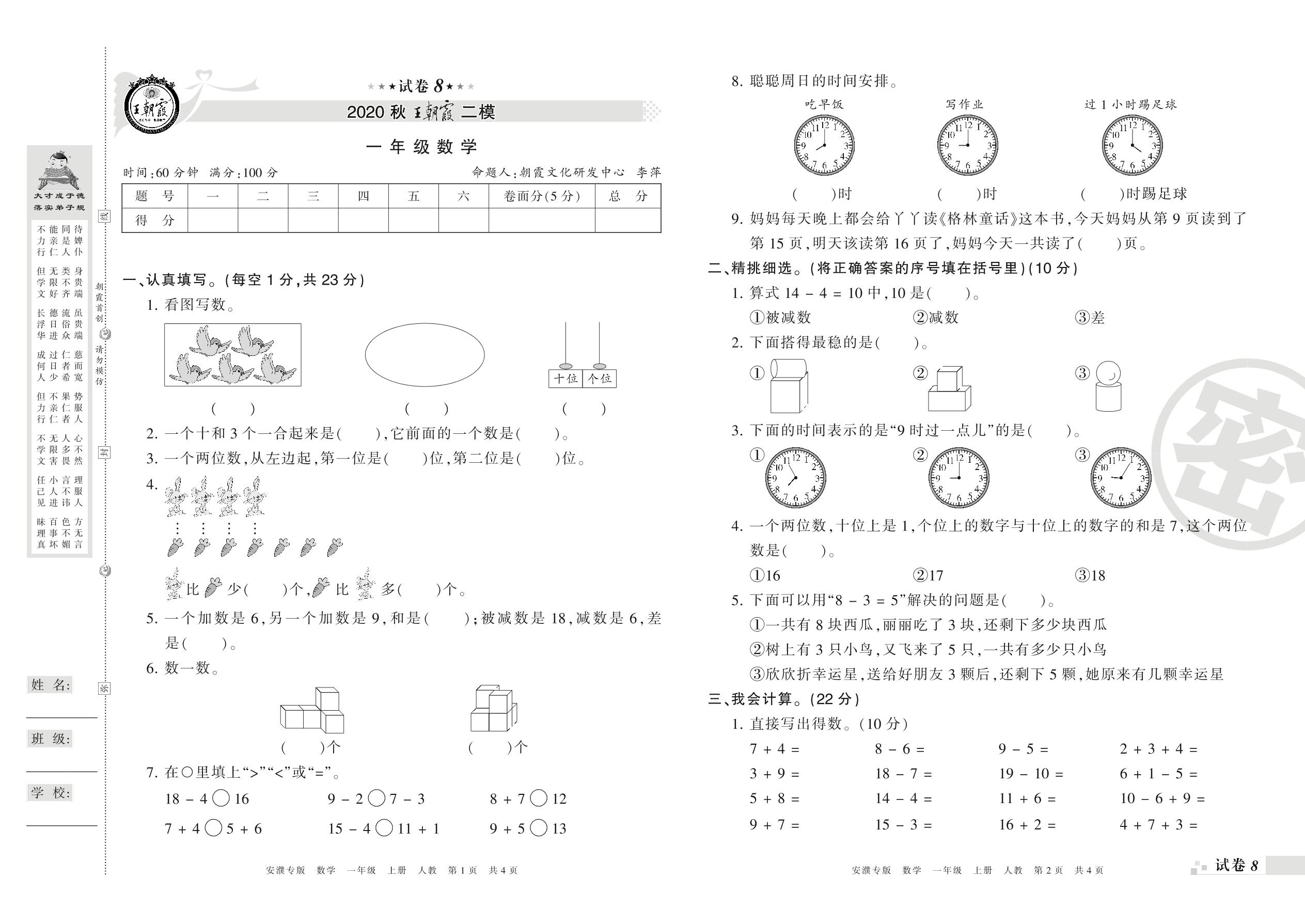 王朝霞期末模拟卷一年级上册数学(人教版)_R210801185251【8】
