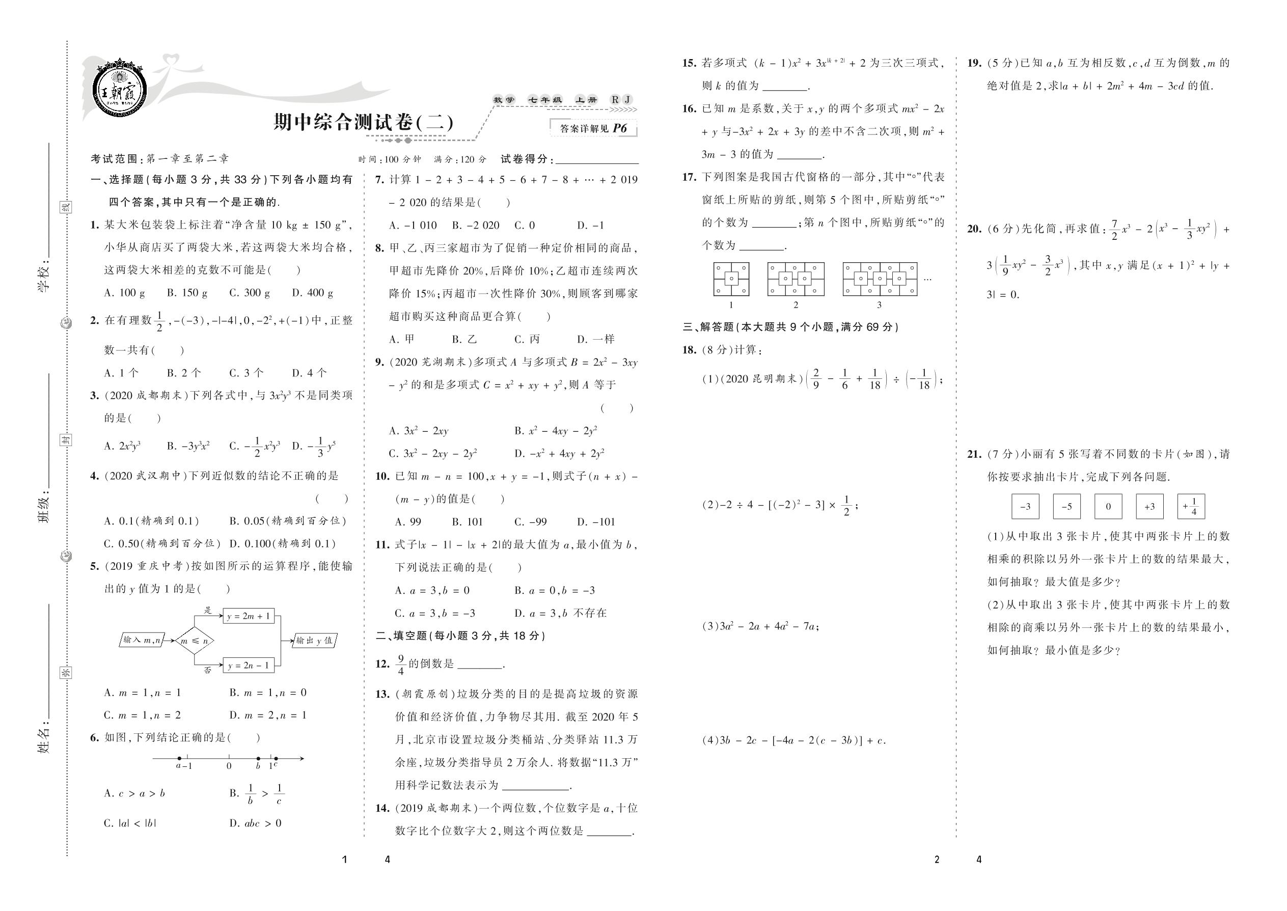 2020上册七年级数学人教版 期中综合测试卷(二)