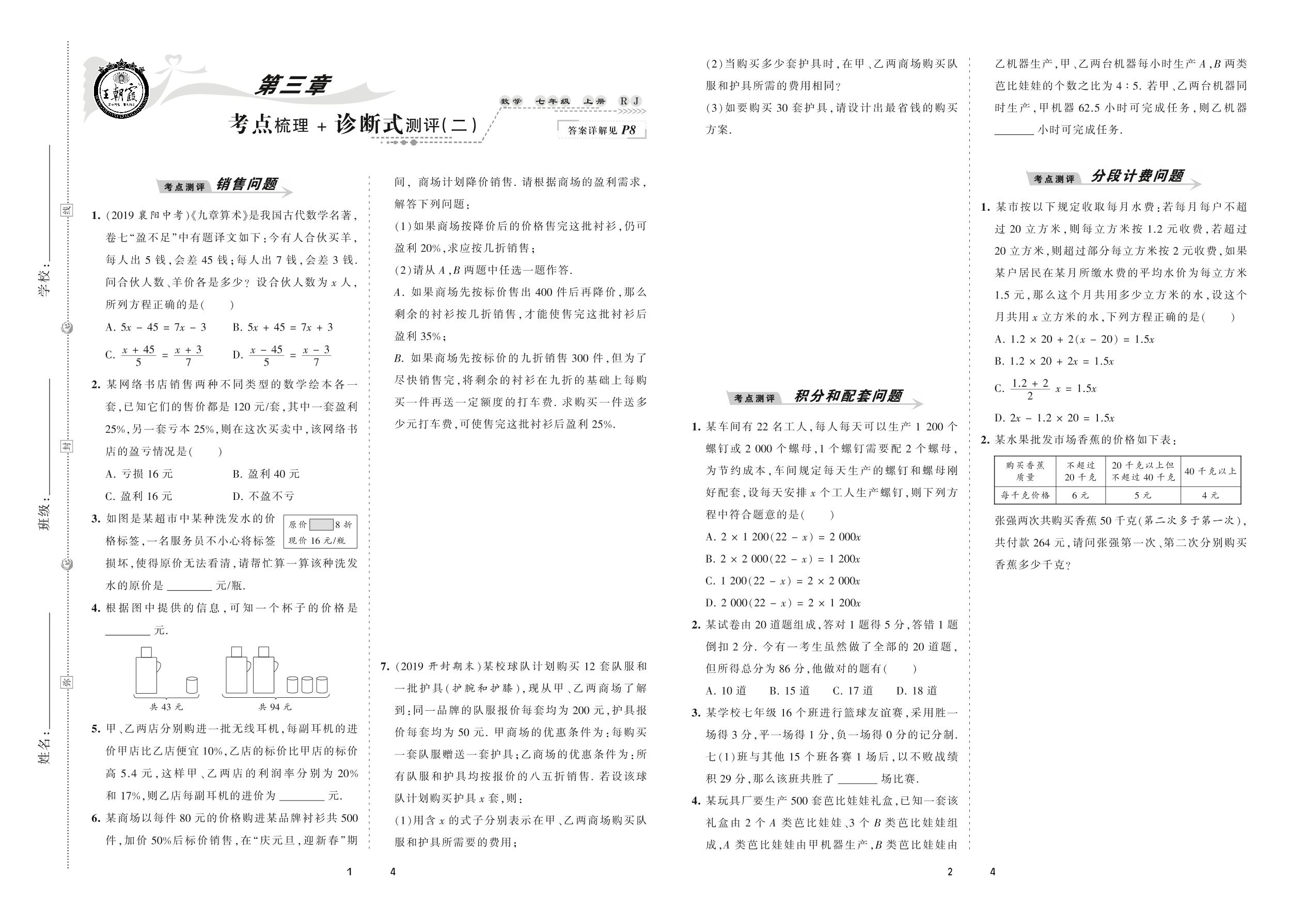 2020上册七年级数学人教版 第三章 考点梳理 + 诊断式测评(二)