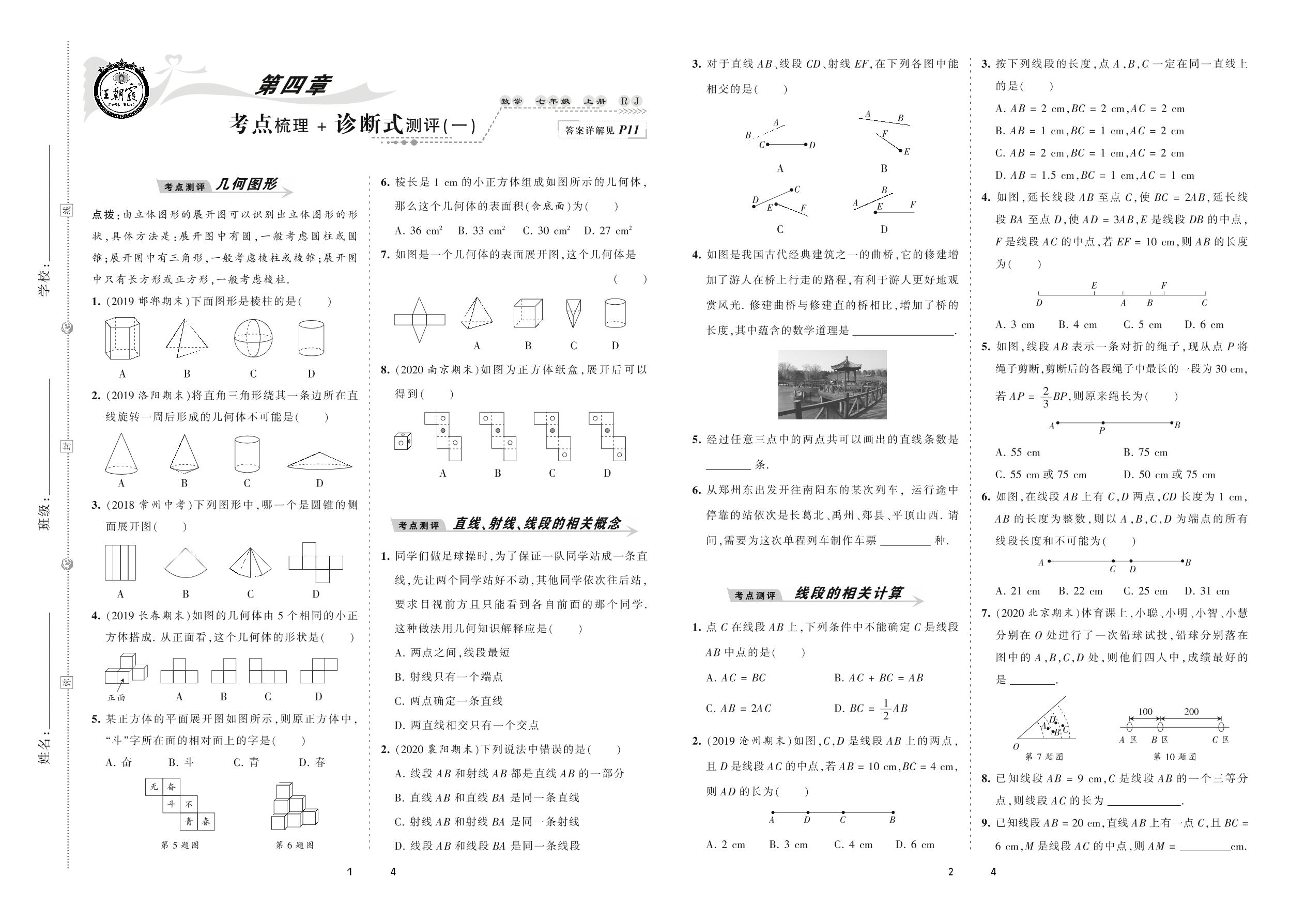 2020上册七年级数学人教版 第四章 考点梳理 + 诊断式测评(一)