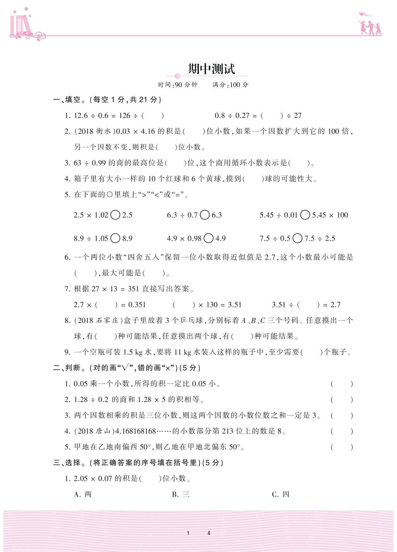 2020上册五年级数学冀教版 期中测试