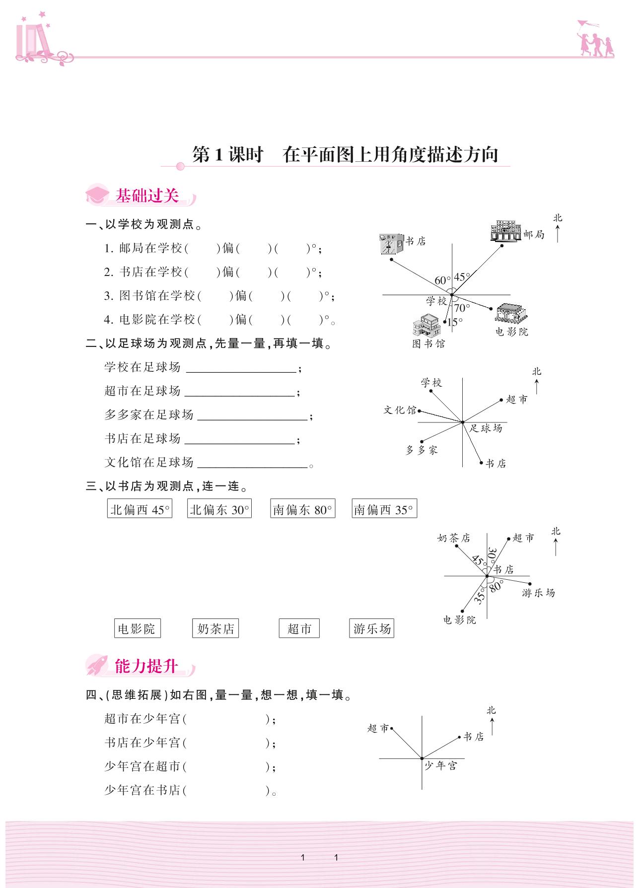 2020上册五年级数学冀教版 一 方向与路线——第1课时 在平面图上用角度描述方向