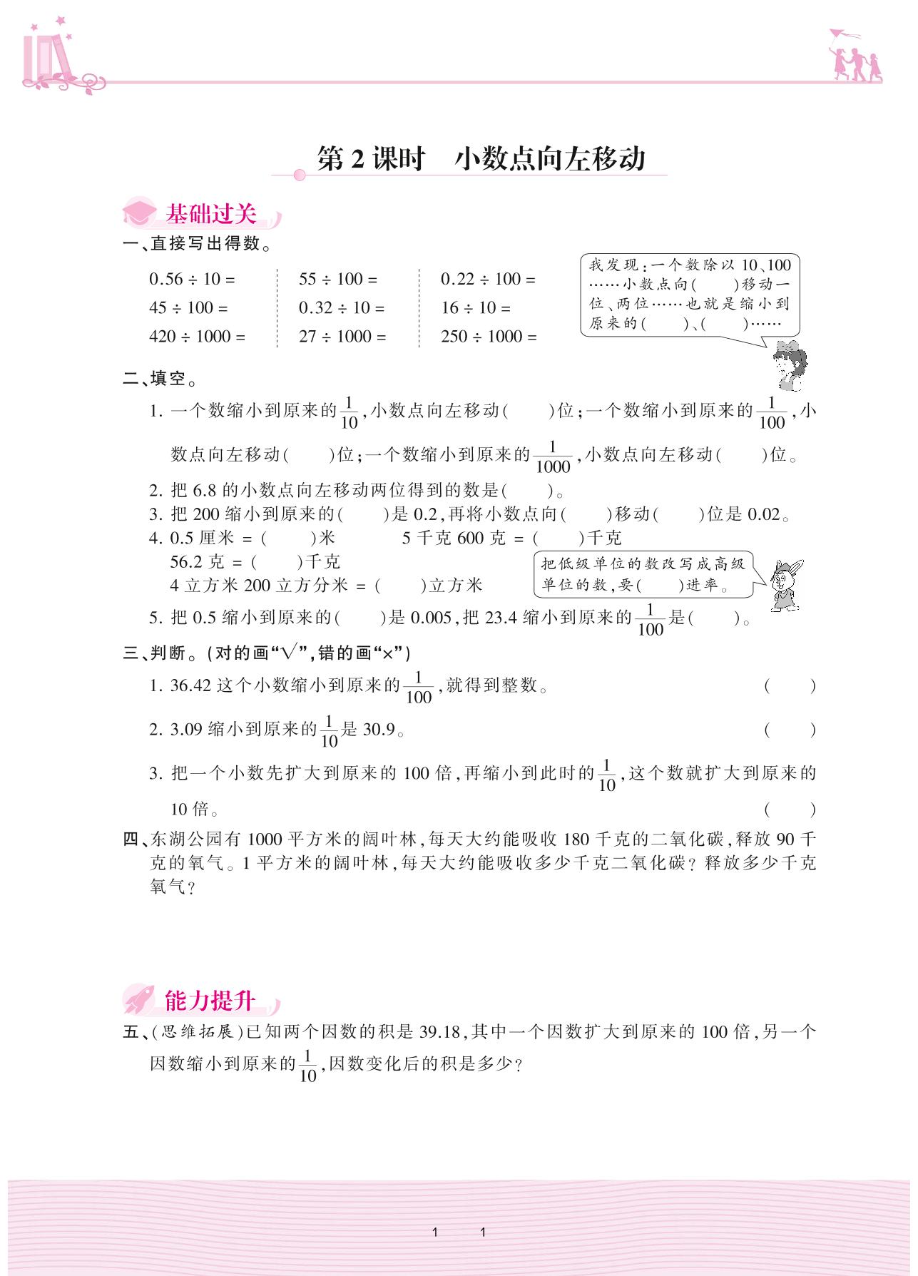 2020上册五年级数学冀教版 二 小数乘法 1. 小数点位置变化——第2课时 小数点向左移动