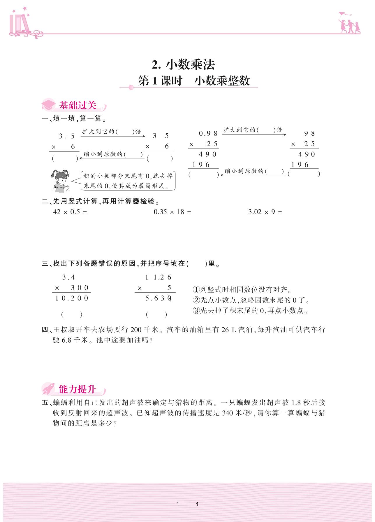 2020上册五年级数学冀教版 二 小数乘法 2. 小数乘法——第1课时 小数乘整数