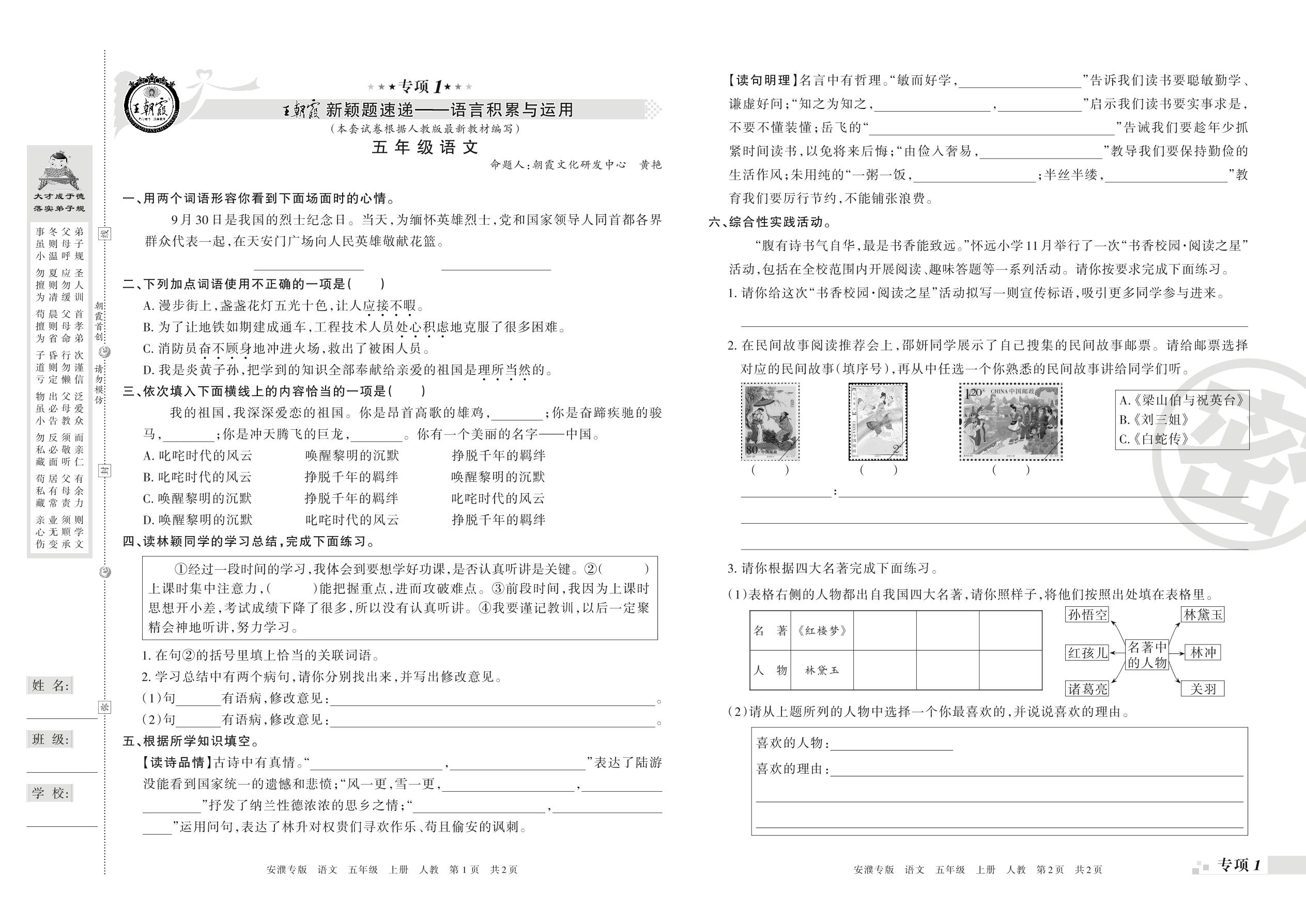 王朝霞期末专项卷——语言积累与运用、非连续性文本阅读五年级上册语文(人教版)_R210801185304【0】