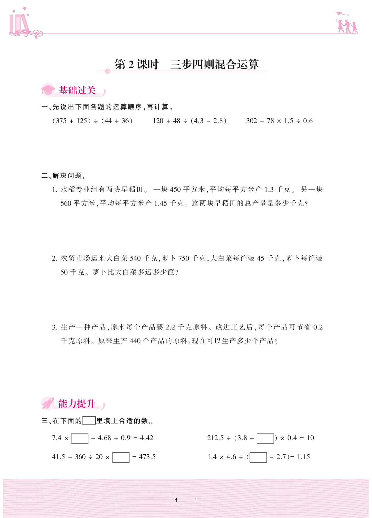 2020上册五年级数学冀教版 五 四则混合运算(二)——第2课时 三步四则混合运算
