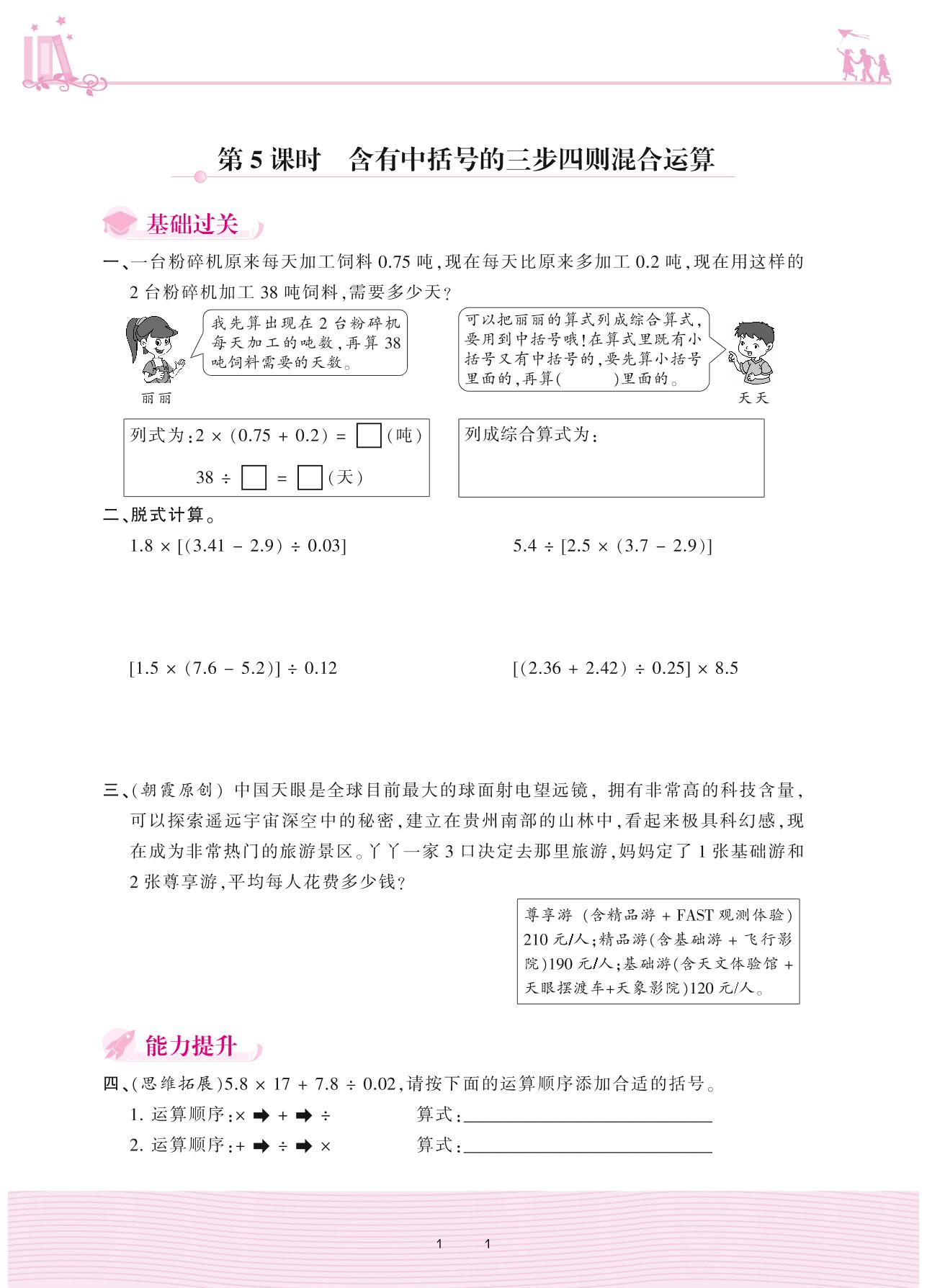 2020上册五年级数学冀教版 五 四则混合运算(二)——第5课时 含有中括号的三步四则混合运算