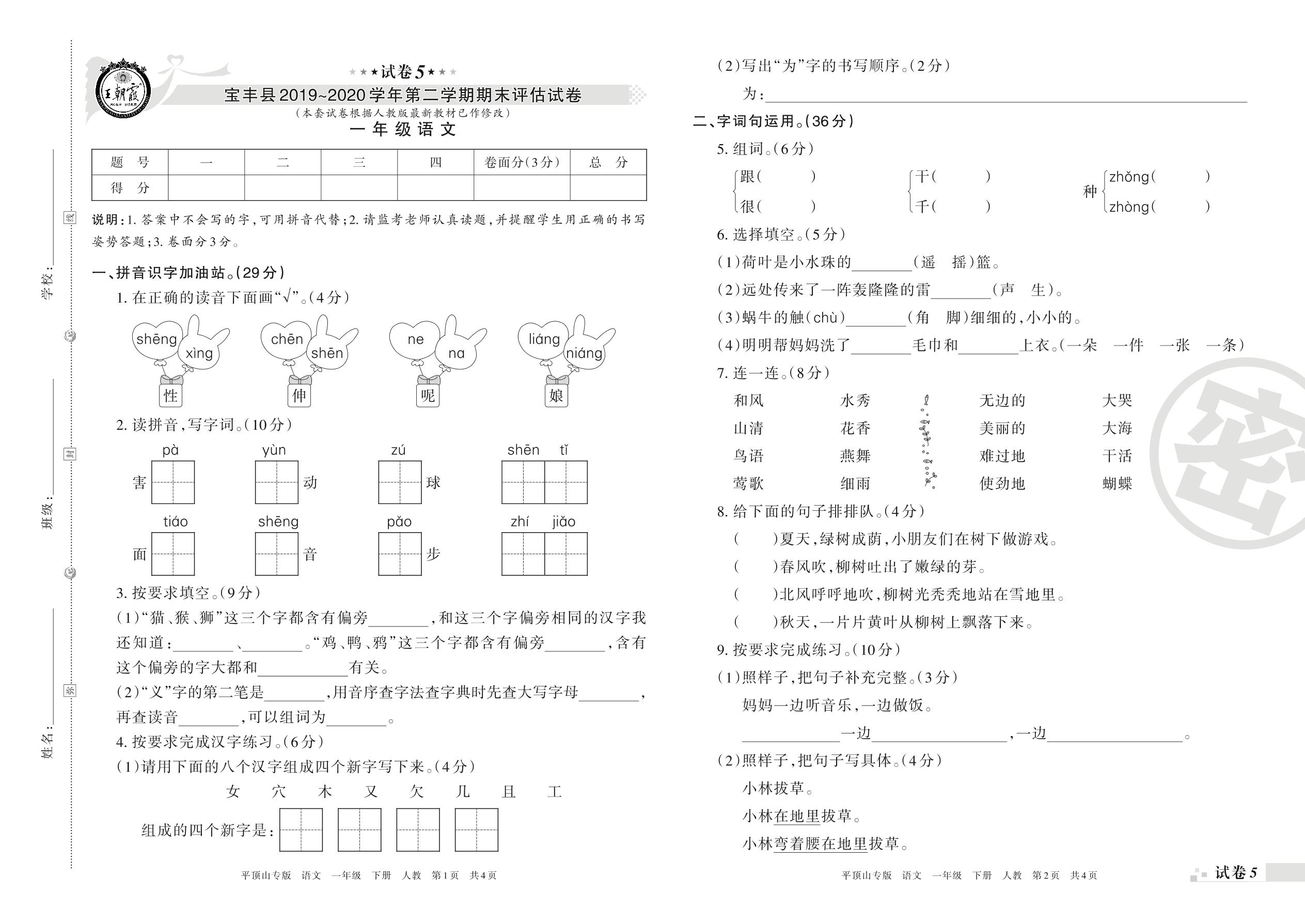 2019-2020学年第二学期平顶山市宝丰县一年级语文试卷(人教版)【5】