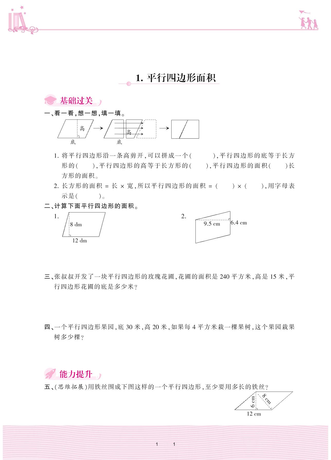 2020上册五年级数学冀教版 六 多边形的面积 1. 平行四边形面积