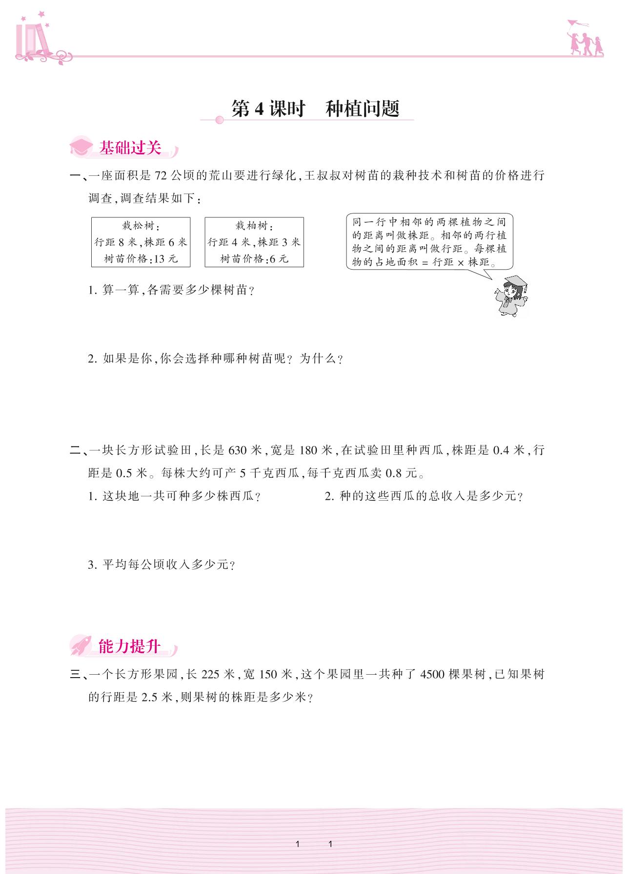 2020上册五年级数学冀教版 七 土地的面积——第4课时 种植问题