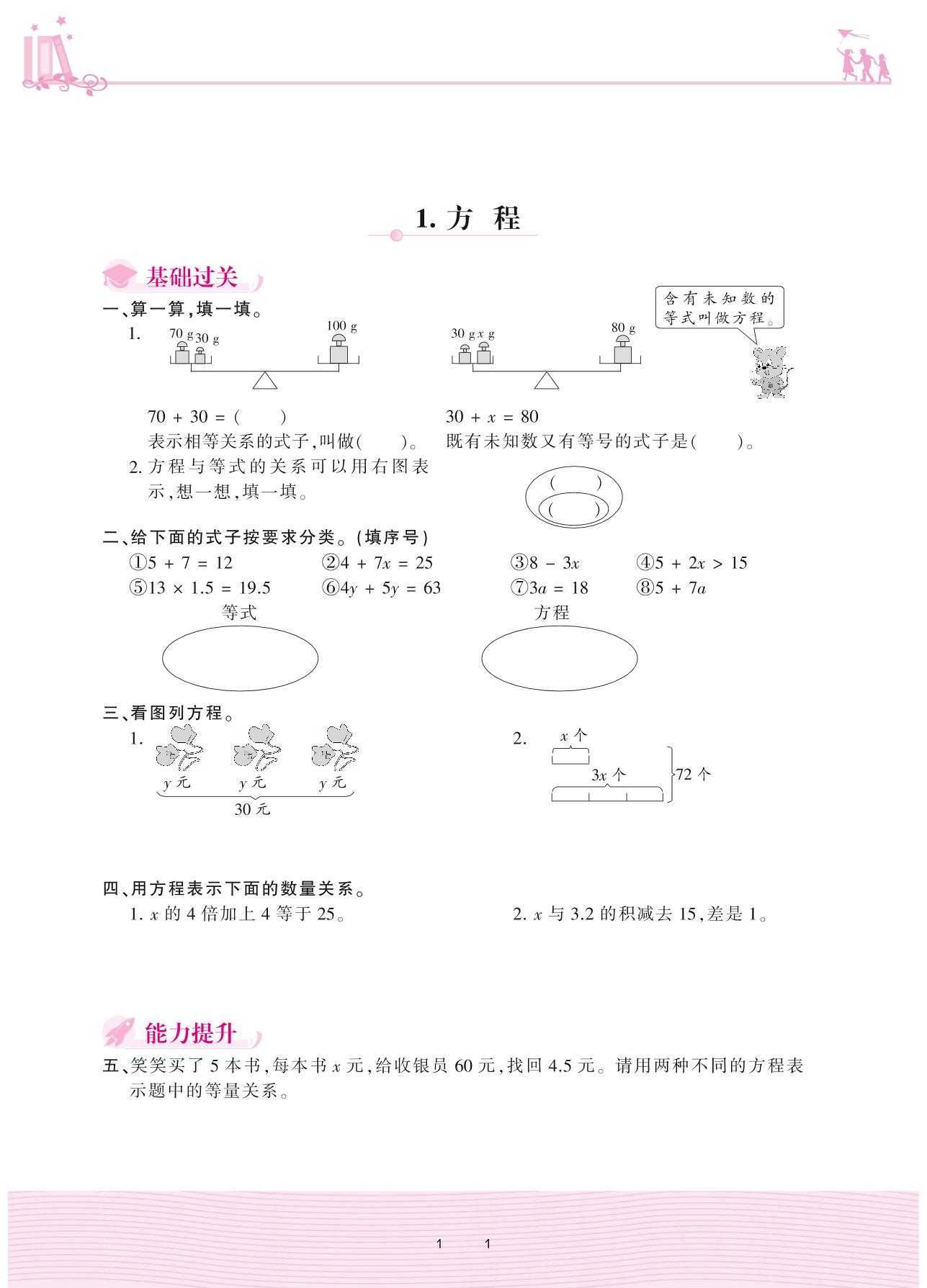 2020上册五年级数学冀教版 八 方程 1. 方程
