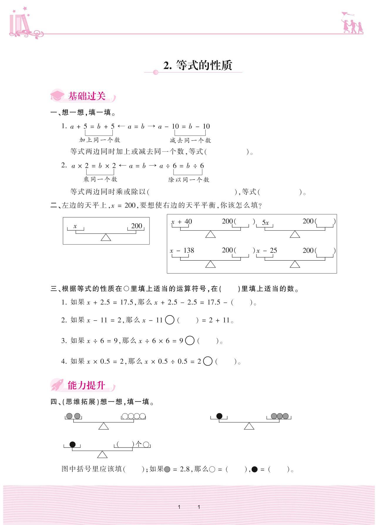 2020上册五年级数学冀教版 八 方程 2. 等式的性质