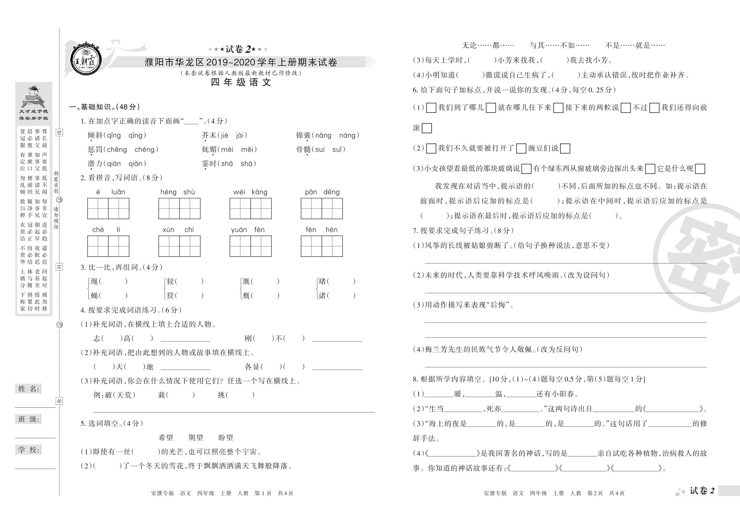 2019-2020学年第一学期濮阳市华龙区四年级语文试卷(人教版)【2】