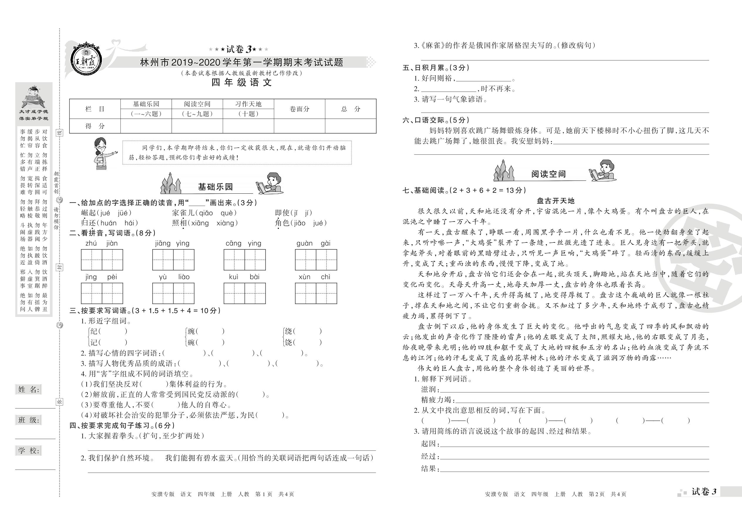 2019-2020学年第一学期林州市四年级语文试卷(人教版)【3】