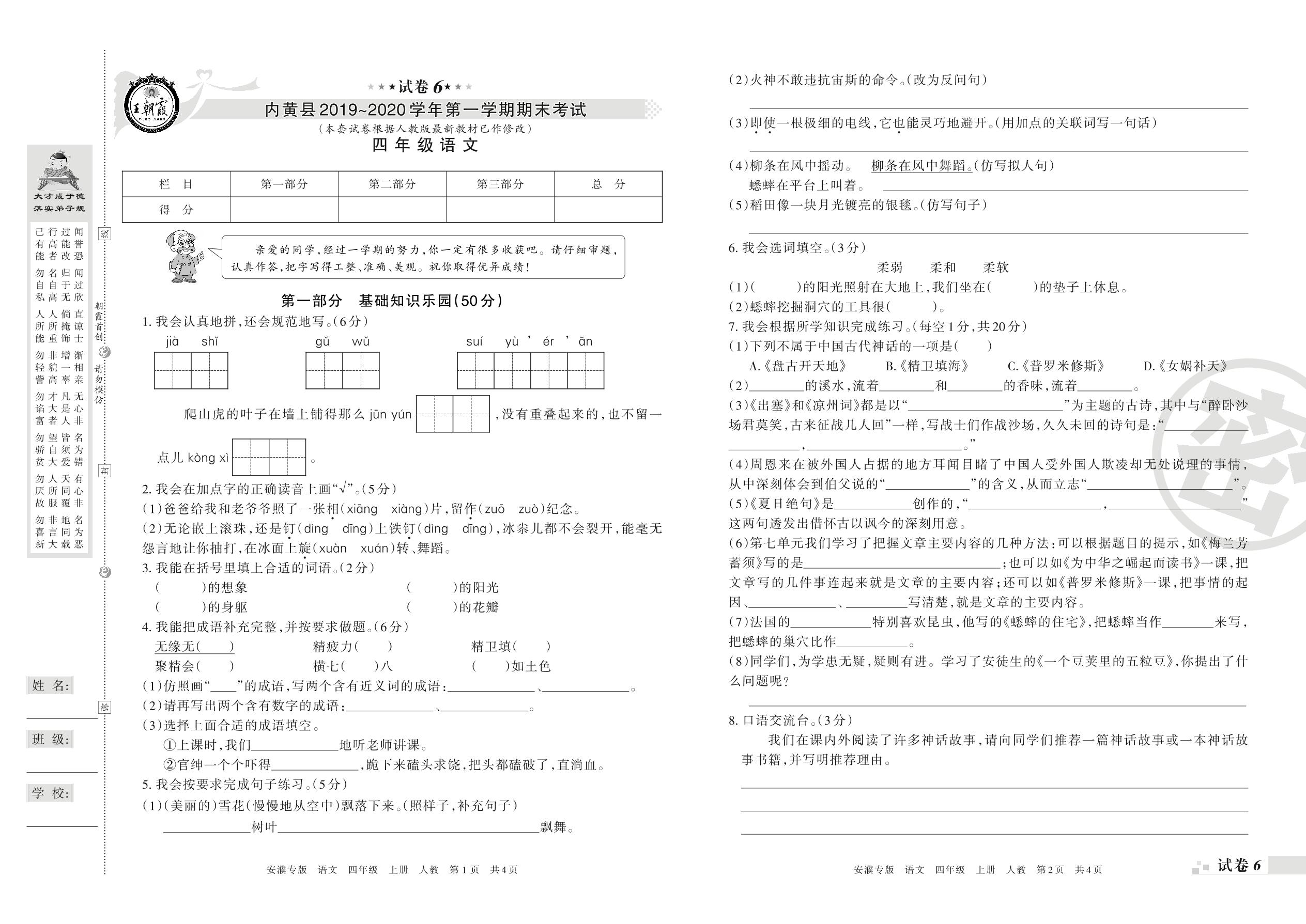 2019-2020学年第一学期安阳市内黄县四年级语文试卷(人教版)【6】