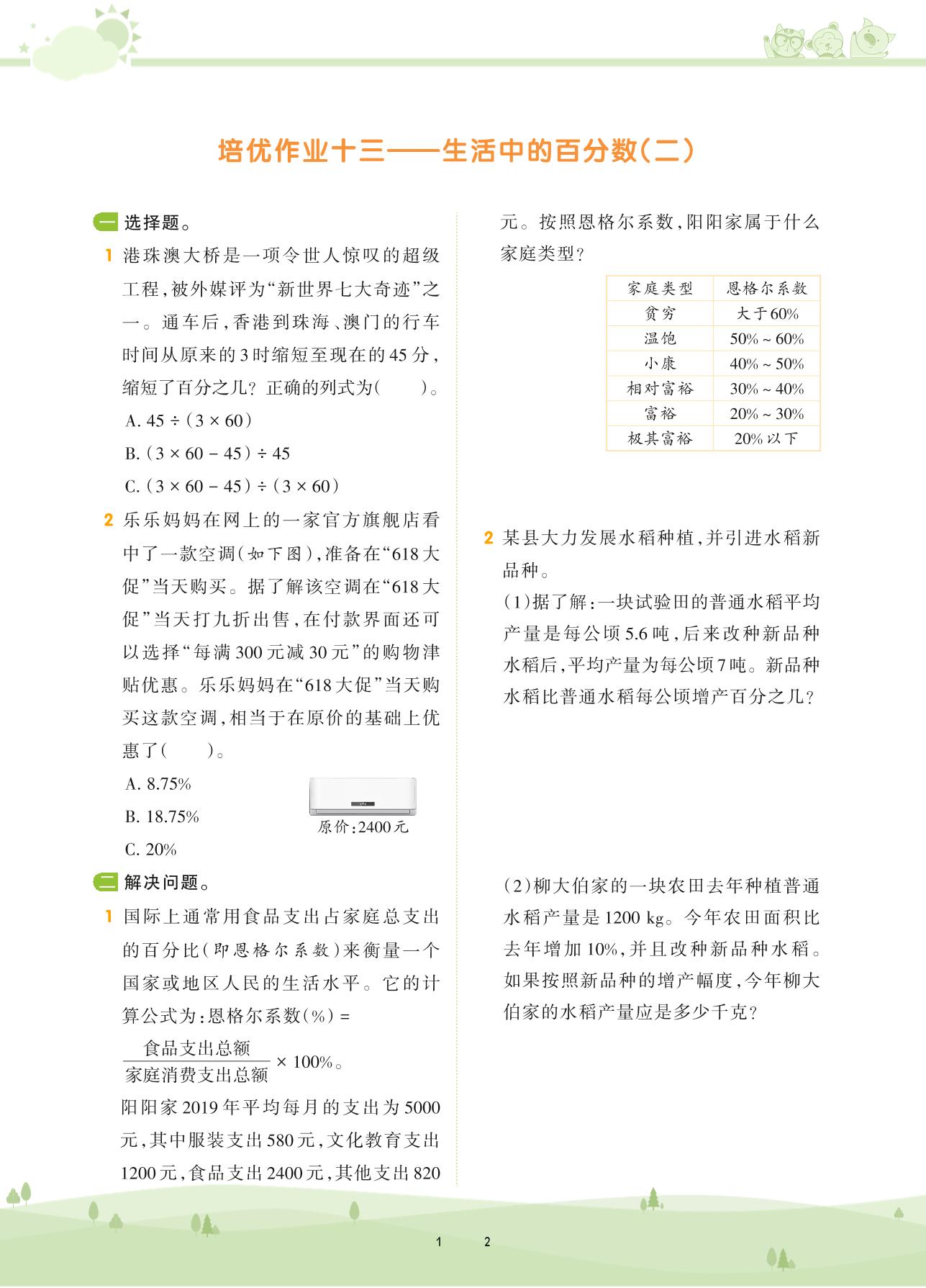 2020上册六年级数学北师版 第七单元 百分数的应用——培优作业十三——生活中的百分数(二)