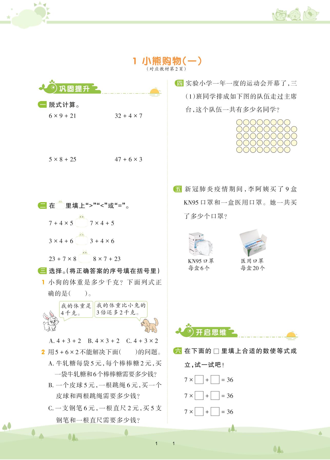 2020上册三年级数学北师版 第一单元 混合运算——1 小熊购物(一)