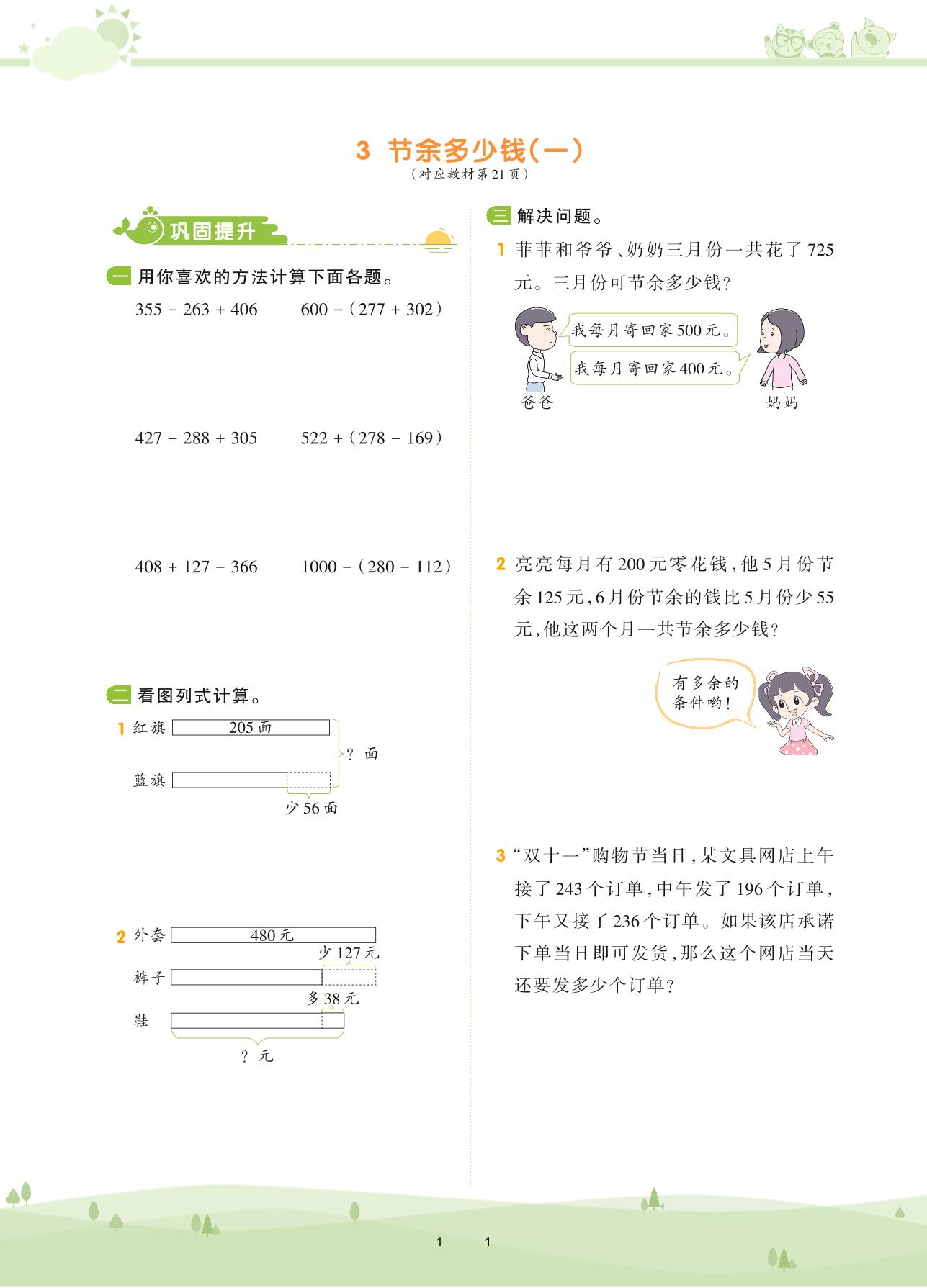 2020上册三年级数学北师版 第三单元 加与减——3 节余多少钱(一)