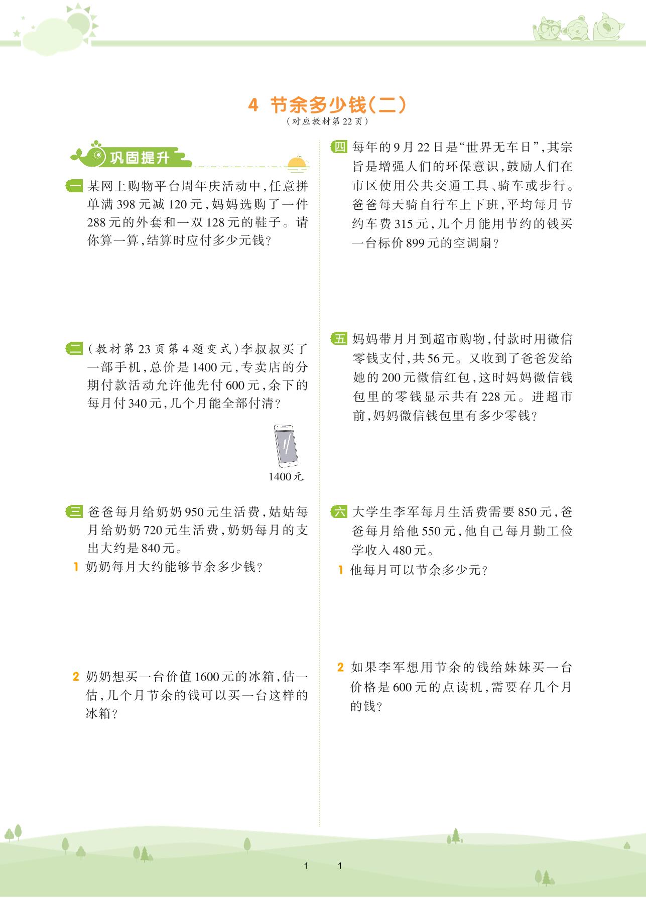 2020上册三年级数学北师版 第三单元 加与减——4 节余多少钱(二)