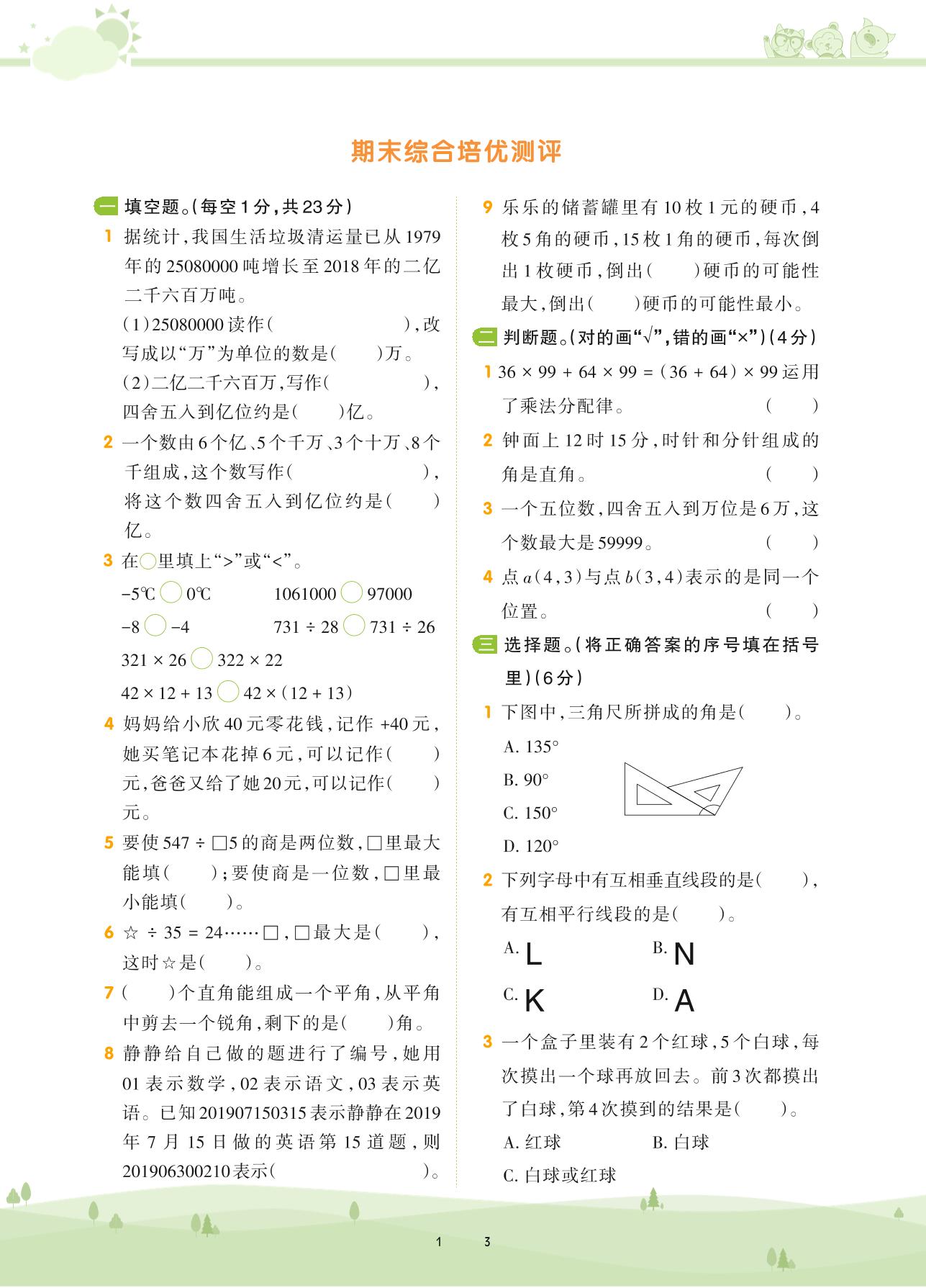 2020上册四年级数学北师版 期末综合培优测评