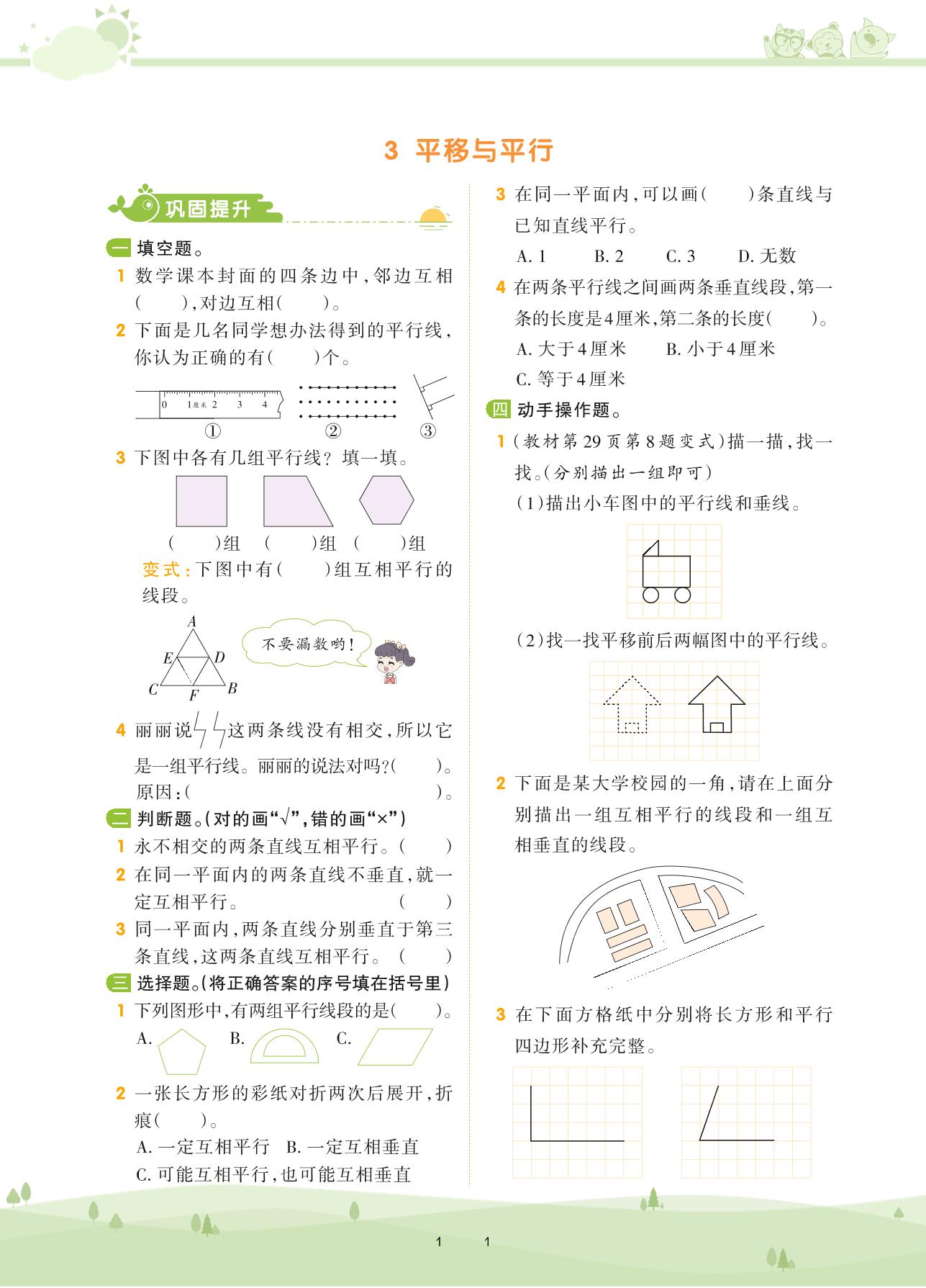2020上册四年级数学北师版 第二单元 线与角——3 平移与平行