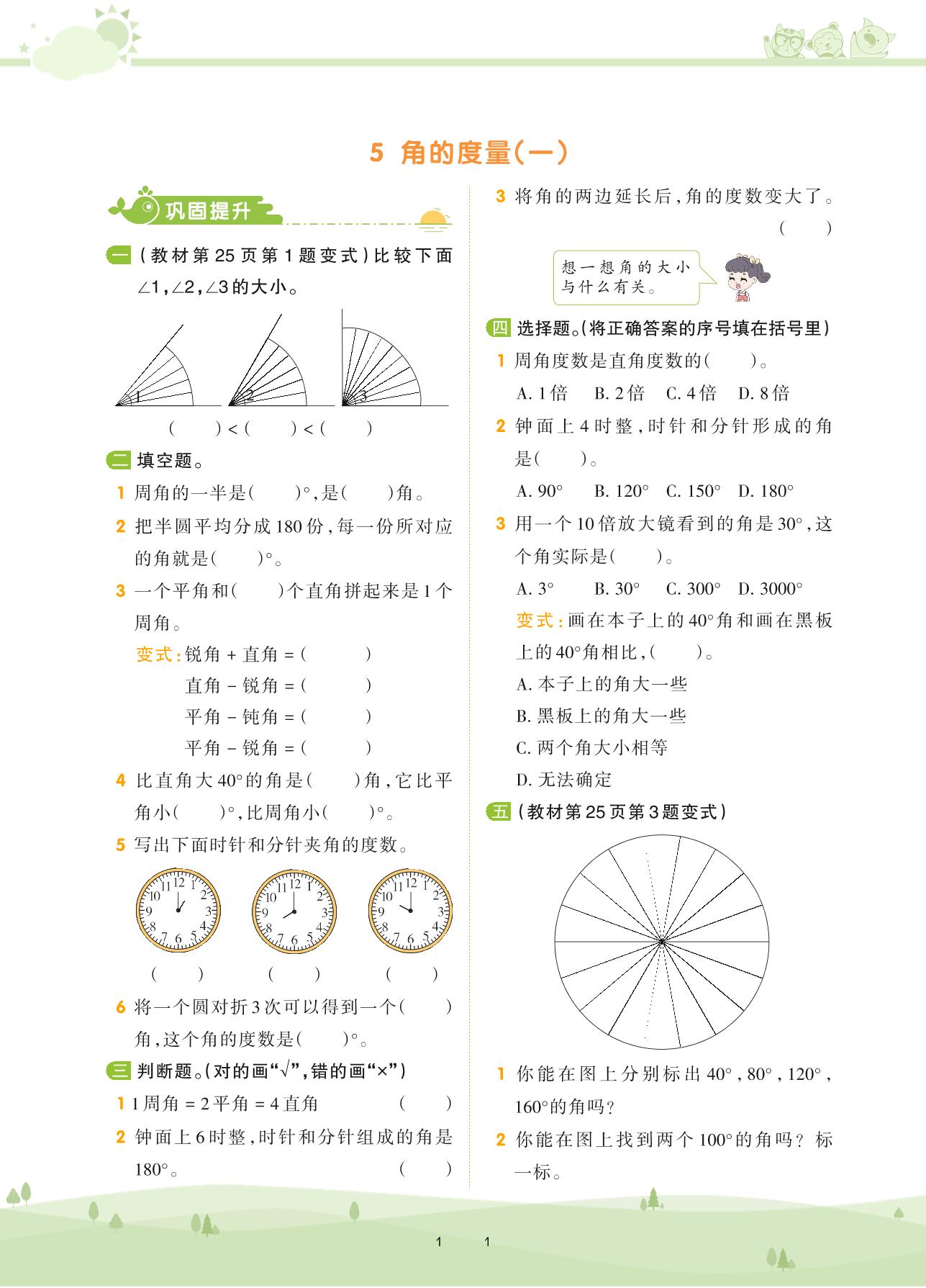 2020上册四年级数学北师版 第二单元 线与角——5 角的度量(一)